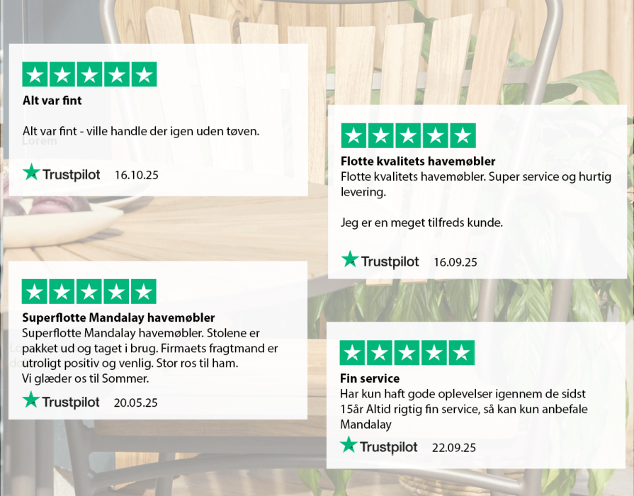 Historien om Mandalay går over 30 år tilbage, og vi er i dag et veletableret brand inden for havemøbler med afsæt i skandinaviske designtraditioner. Tilbage fra de første teak-havemøbler til de stilrene møbler med vedligeholdelsesfrie materialer - og naturligvis Marguerit-serien.
