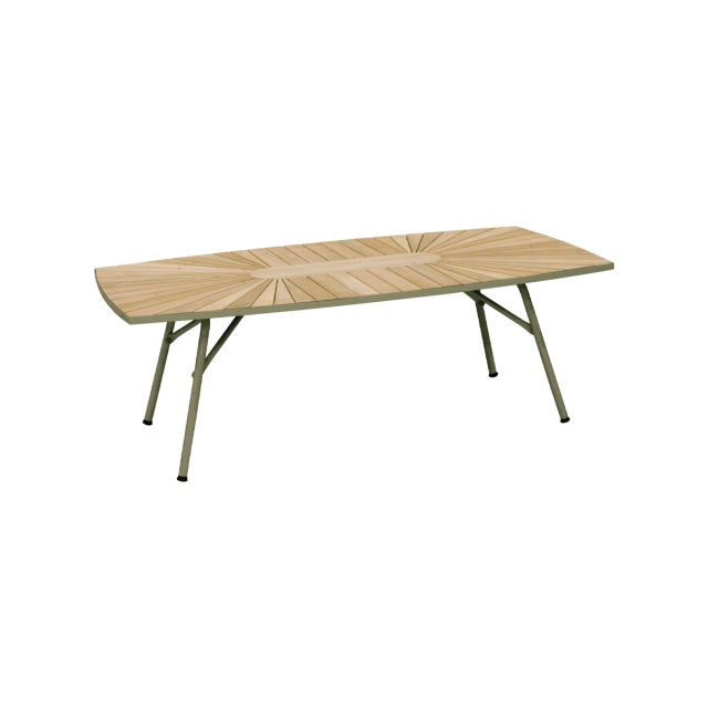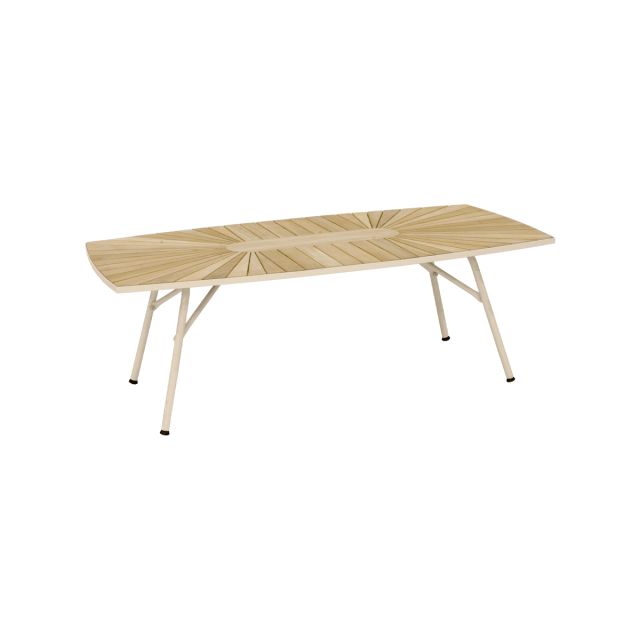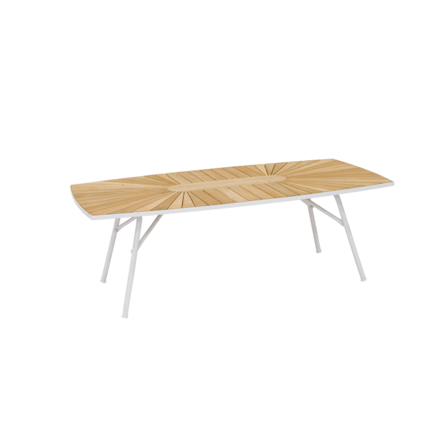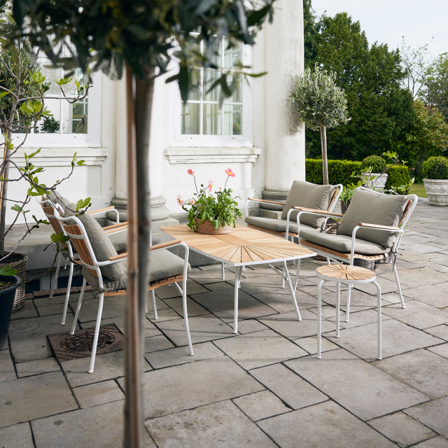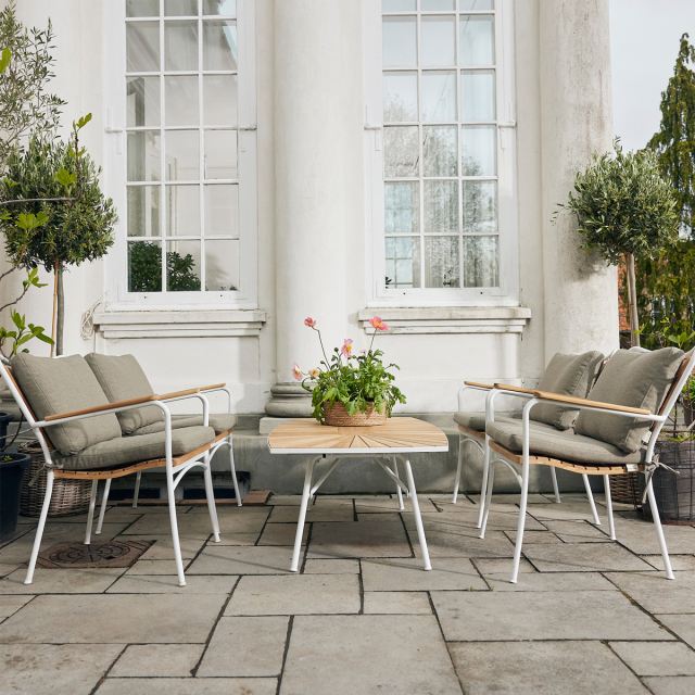 Skab din egen lounge-område på terrassen med et bord og 4 lounge-stole. Eller indret din udestue på en helt ny måde. Det lave lounge-bord er fremstillet i bæredygtig indonesisk plantageteak og pulverlakeret alumineum - så det ruster ikke.