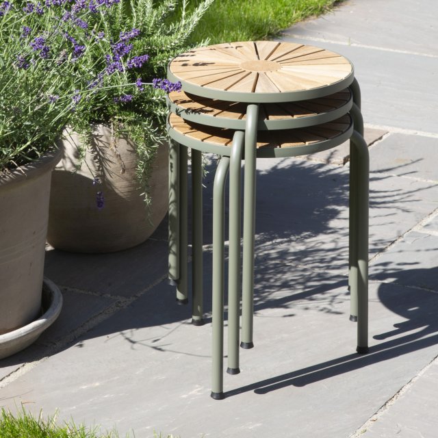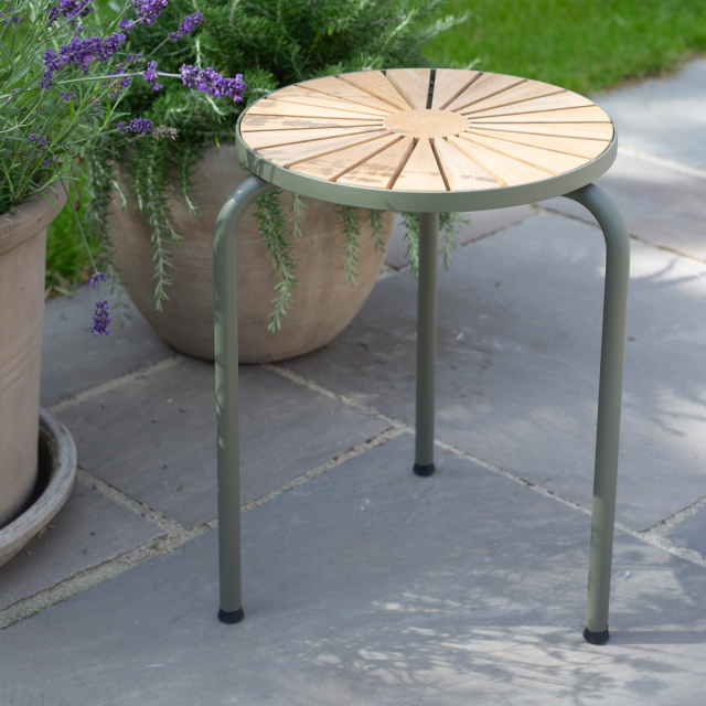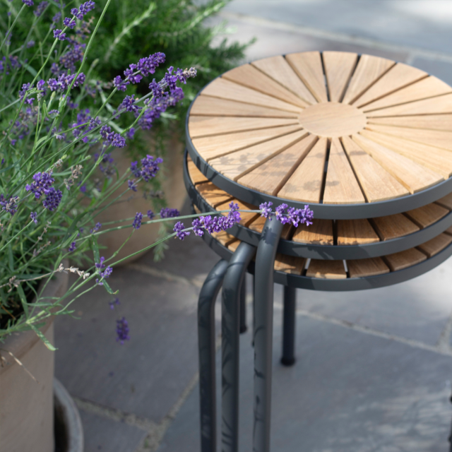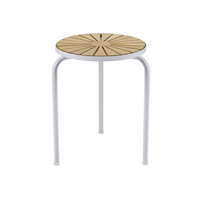Lille taburet i det klassiske Marguerit-design. Velegnet til både entré, til terrassen og altanen. Som resten af serien, er den lavet med pulverlakeret aluminium og klassisk indonesisk teaktræ.