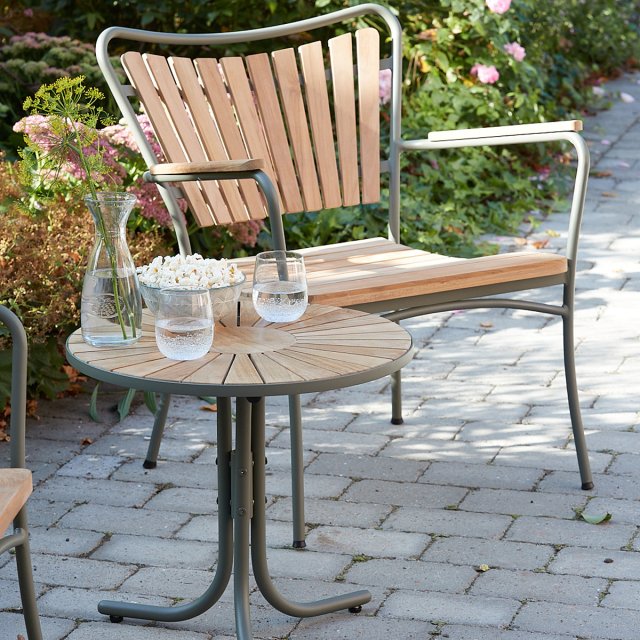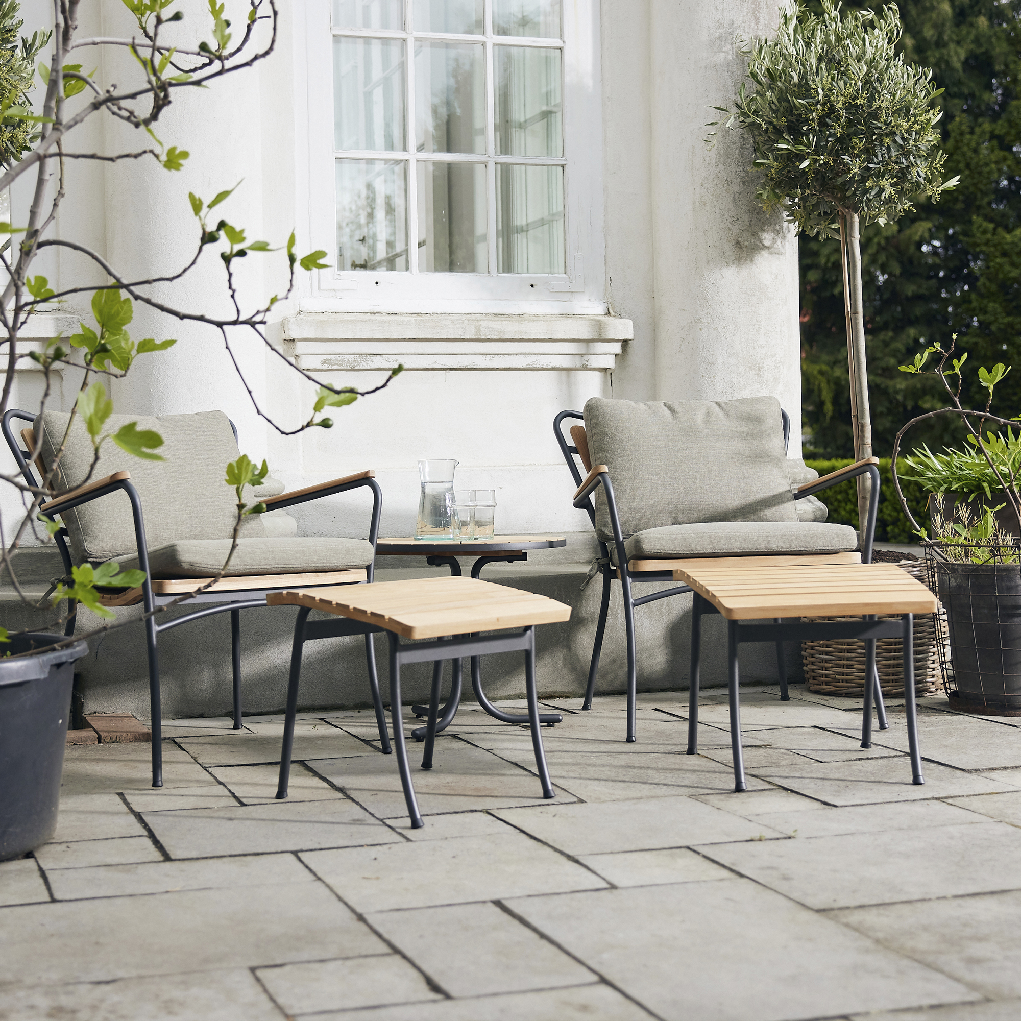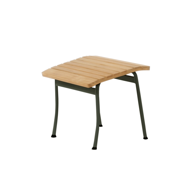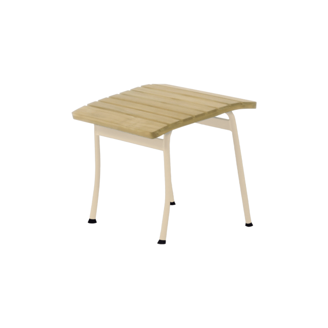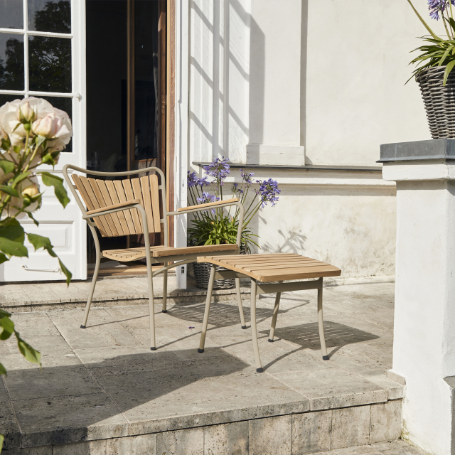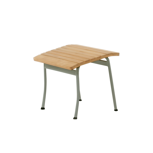 Skamlen er selvfølgelig fremstillet i bæredygtig indonesisk plantageteak og stel med kraftig og slidstærk pulverlakering.