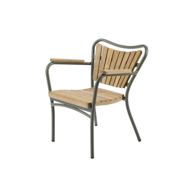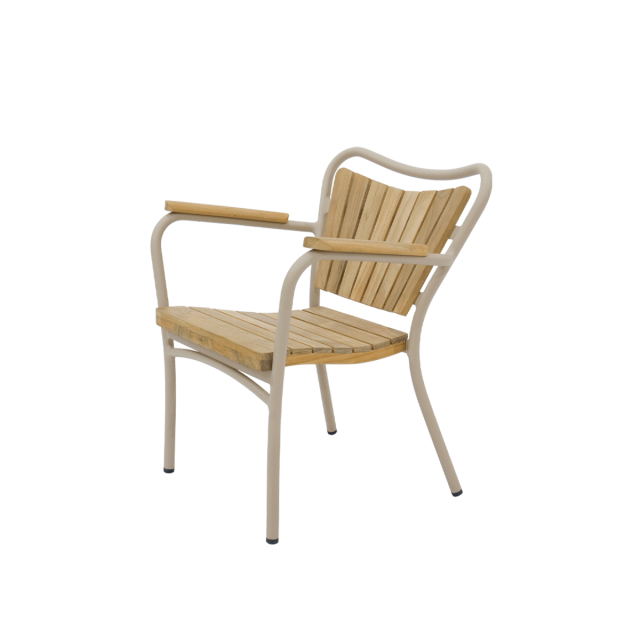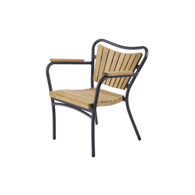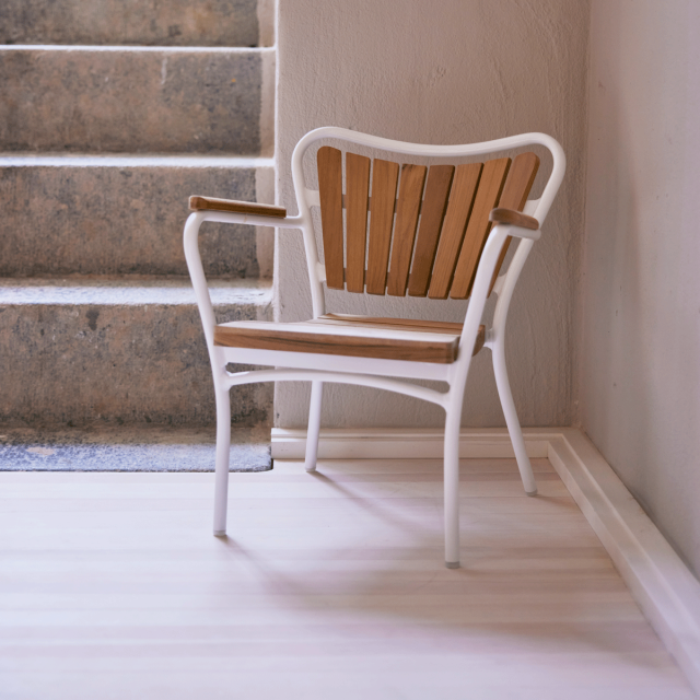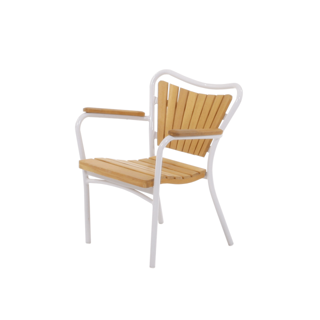 Marguerit børnestolen er en stabelbar letvægts havestol til børn i Marguerit havemøbel-serien. Sæde, ryg og armlæn i bæredygtig teak og stellet pulverlakeret i aluminium.