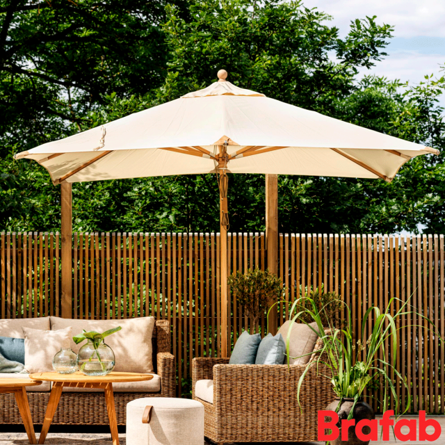 Til parasollen anbefaler vi at benytte en parasolfod på minimum 50 kg. Eksempelvis Brafabs Mito-parasolfod.