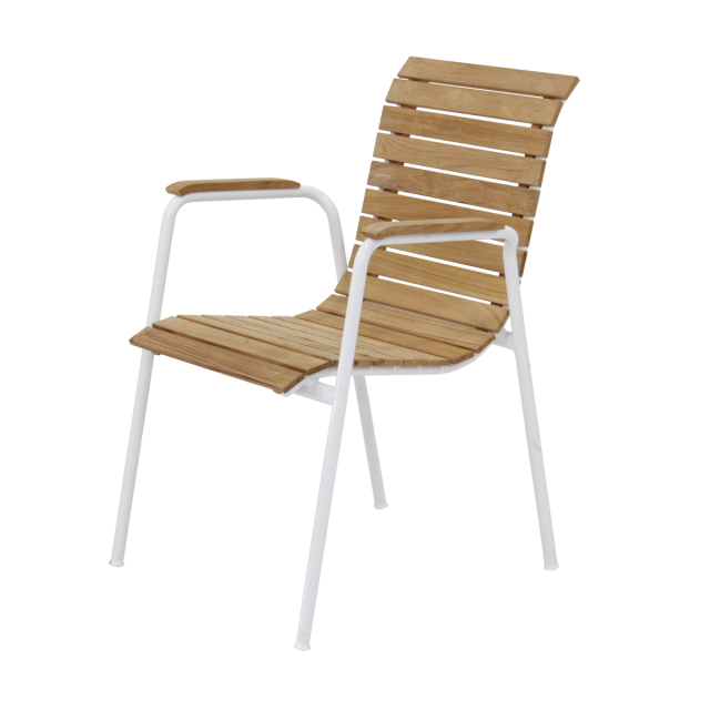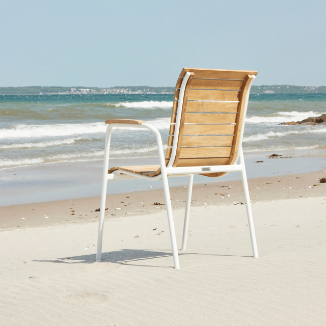 Bellevue stolen er med klassisk indonesisk teak og stel i pulverlakeret aluminium - og den kan naturligvis stables.