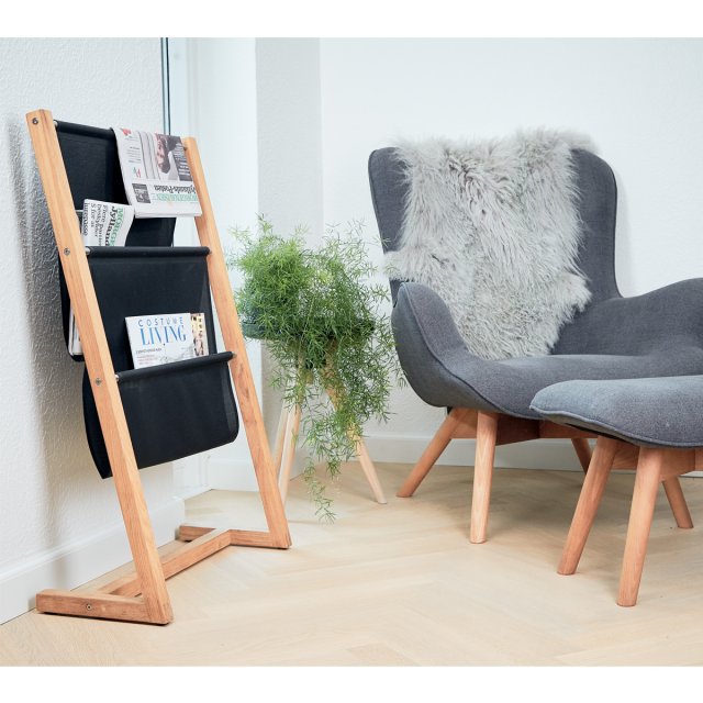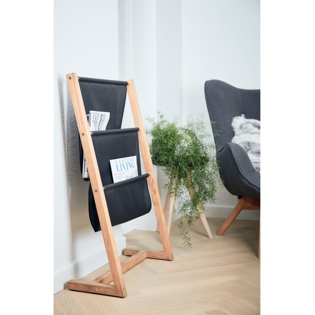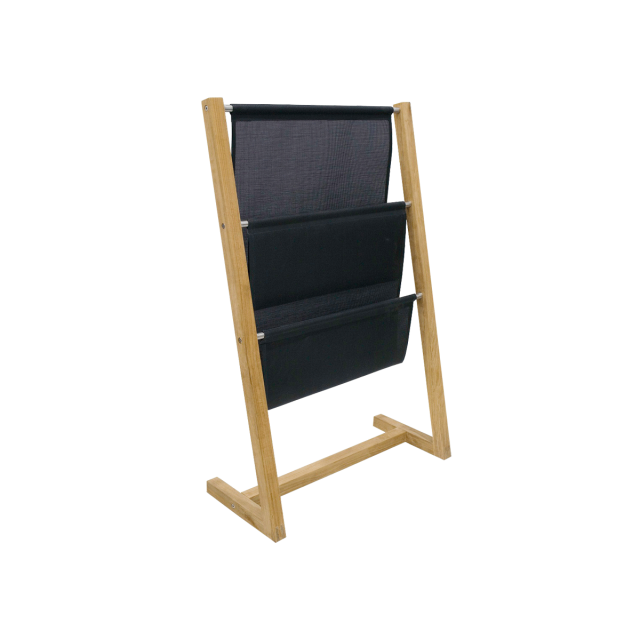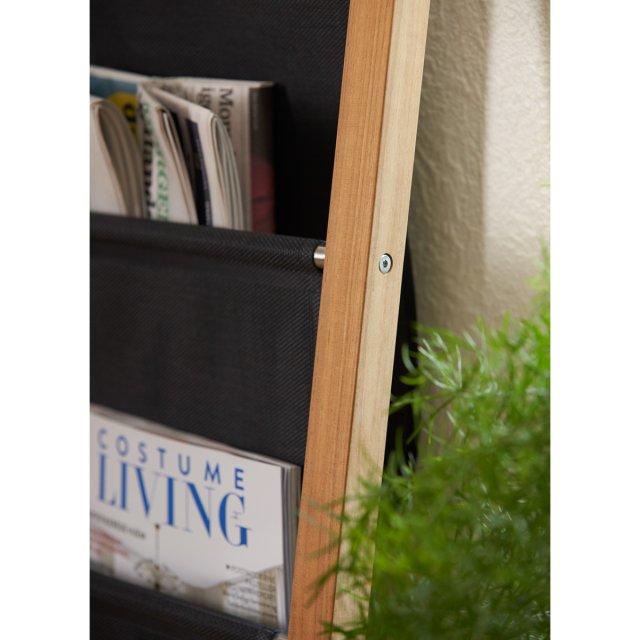 Magasinholderen er i teak, rør i rustfrit stål og kraftig Textilene til magasinerne