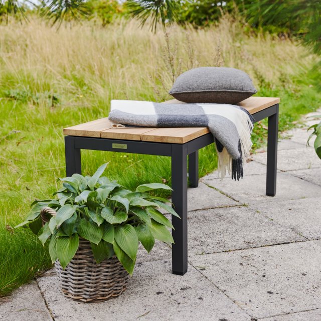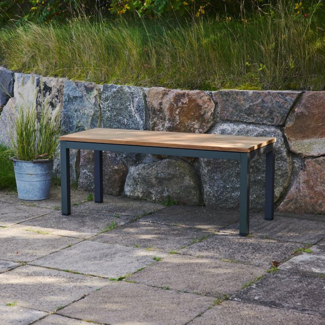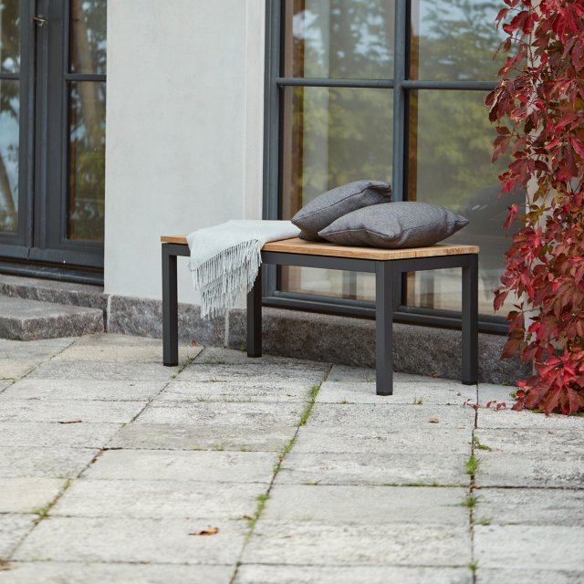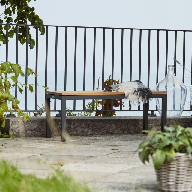 Toscana havebænk i minimalistisk skandinavisk design med sæde i bæredygtig indonesisk teak og stel i pulverlakeret aluminium. Bænken har en praktisk længde, der gør den velegnet til både pladsen langs husmuren, på altanen, men også som siddepladser langs Toscana havebordet L132. Vælger du den sidste løsning har du et smukt bord-og-bænke-sæt, hvor havebænkene kan skubbes ind under bordet.