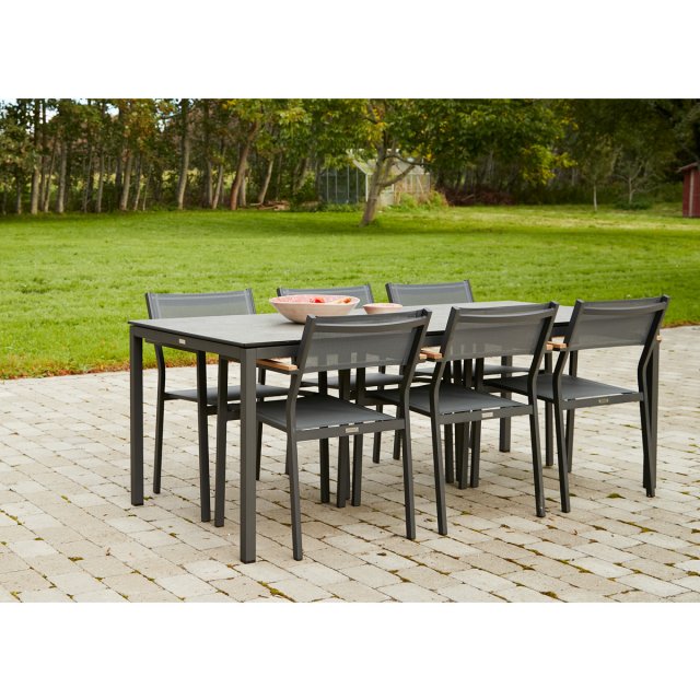 Elba bordet har en bordplade i et slidstærk og ridsefast materiale - kompaktlaminat - der tåler vand, olie, frost og meget mere. Stellet er i pulverlakeret aluminium som vi også kender det fra Toscana havebordene.