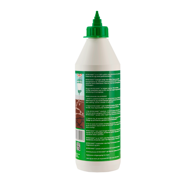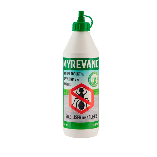 MYREVAND™ bruges til opfyldning af huller skabt af myrer og jordbier, eller huller fra regnorme. Påfyldning er lettest med en 0,750 L flaske. Flasken omrystes inden brug. MYREVAND™ hældes direkte i hullet til boet. Lad evt. flasken stå på hovedet i hullet, så løber det selv ud, efterhånden som det fordeler sig i gangene. Overskydende MYREVAND™ vaskes af med vand