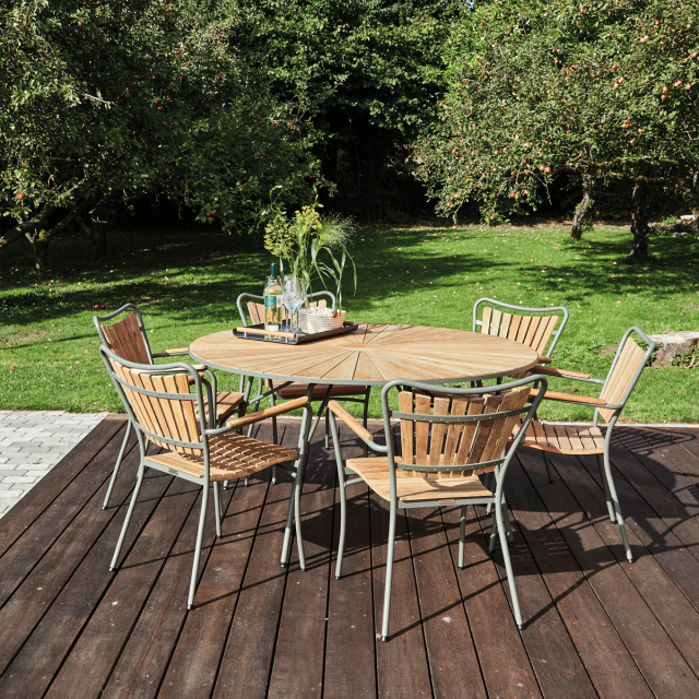 Havebordet måler en diameter på 140 cm. og har bordplade i indonesisk teak og stel i pulverlakeret aluminium.