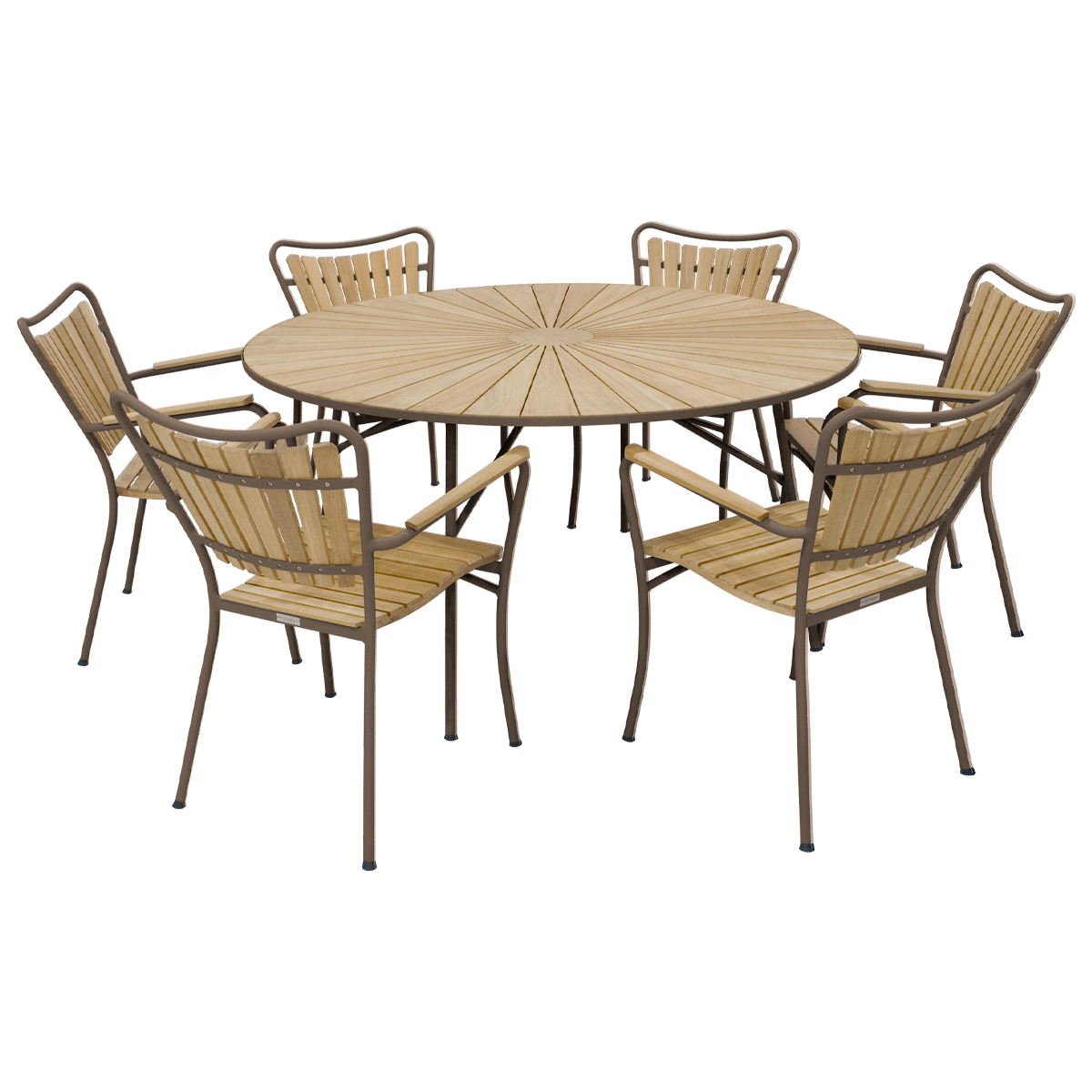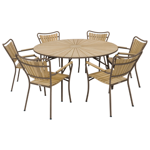 Havebordet måler en diameter på 140 cm og har bordplade i indonesisk teak og stel i pulverlakeret aluminium.