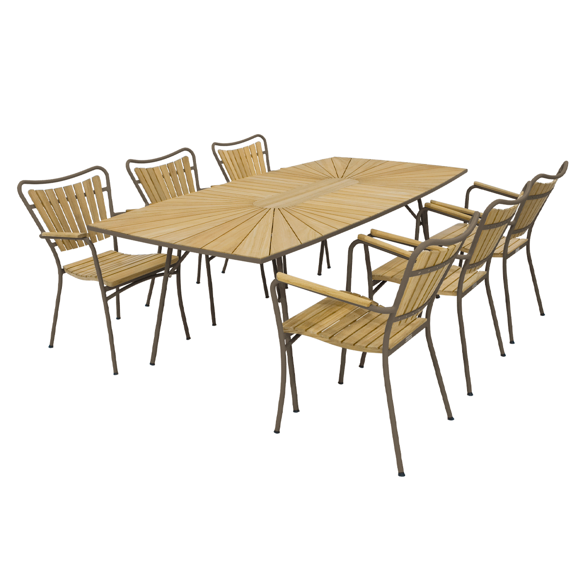 Stort Marguerit havesæt med mocca pulverlakeret stel i aluminium og bordplade i indonesisk plantageteak. Bordet måler hele 2 meter.