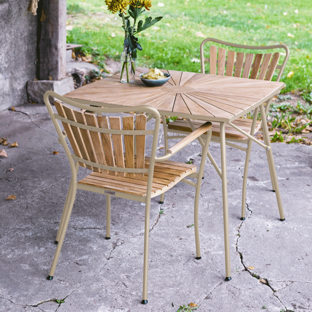 Havebordet måler L83 x B83 x H72 cm og har bordplade i teak og stel i pulverlakeret aluminium