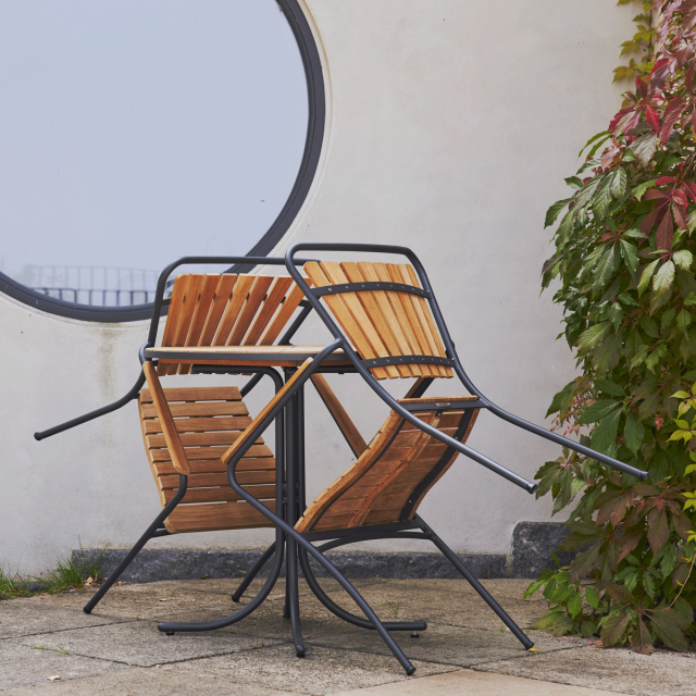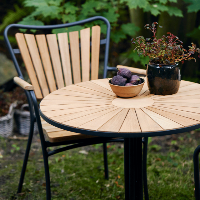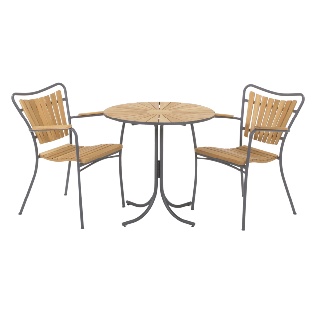 Cafébordet måler en diameter på 70 cm og har en højde på 68 cm - stadig nok til at havestolene kan gå ind under bordpladen. Bordpladen er i teak og stellet i pulverlakeret aluminium. Marguerit havestolene har ergonomisk sæde og ryg. Stellet er i pulverlakeret aluminium. Sæde, ryg og armlæn er i højkvalitets plantageteak. I samarbejde med non-profit organisationen Trees4Trees er der fokus på genplantning i de indonesiske plantager vi får vores teak fra. Læs mere om det her