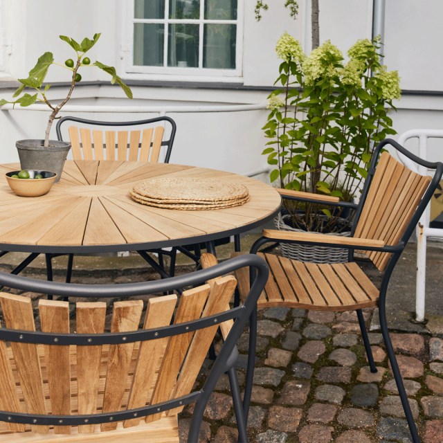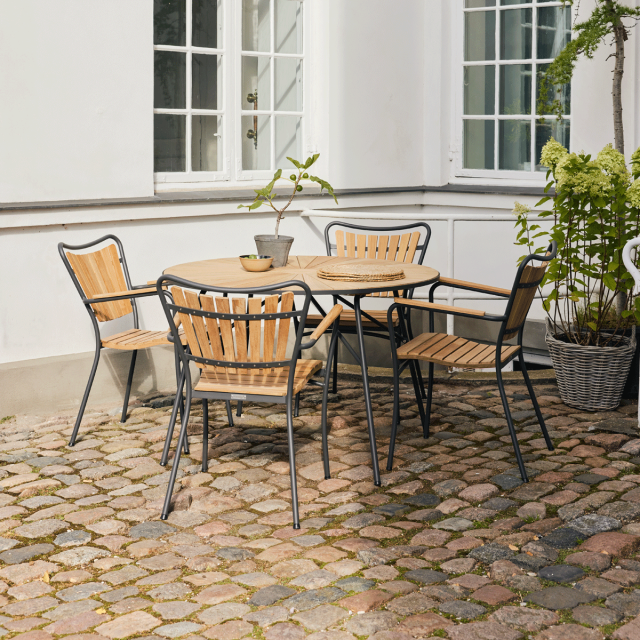 Havebordet måler en diameter på 110 cm og har bordplade i indonesisk plantage teak og stel i pulverlakeret aluminium