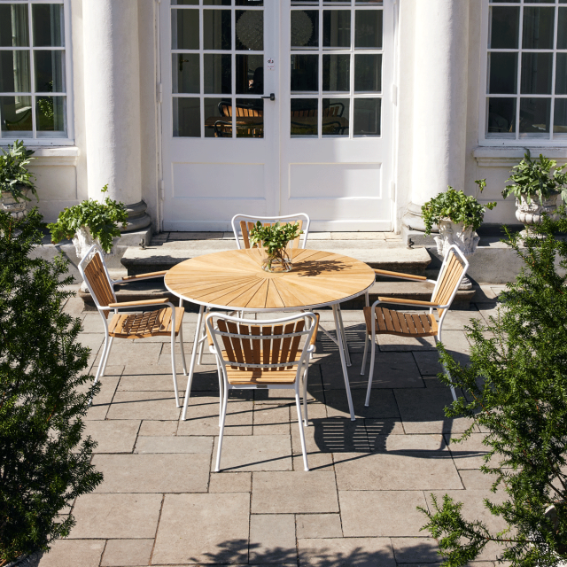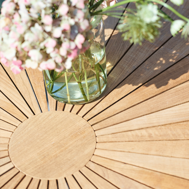 Havebordet måler en diameter på 120 cm og har bordplade i teak og stel i pulverlakeret aluminium