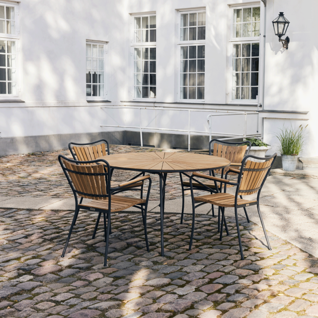 Havebordet måler en diameter på 120 cm og har bordplade i indonesisk plantageteak og stel i pulverlakeret aluminium