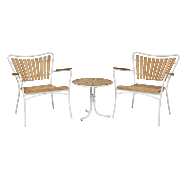 Loungestolen introducerede vi i 2020 i forbindelse med Mandalays 25 års jubilæum - sidebordet kom året efter, så vi nu kan tilbyde en fuld tilbagelænet oplevelse med Marguerit. Modellerne er naturligvis i bæredygtigt indonesisk plantageteak og med stel i pulverlakeret aluminium.  I samarbejde med non-profit organisationen Trees4Trees er der fokus på genplantning i de indoneiske plantager vi får vores teak fra. Læs mere om det her
