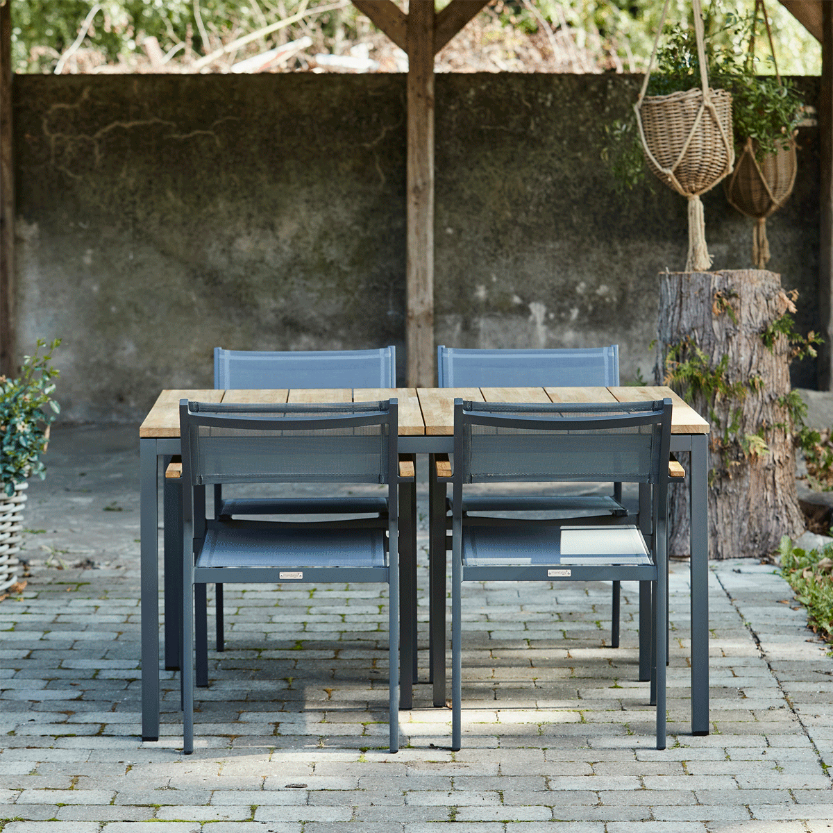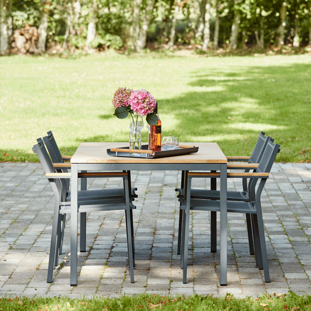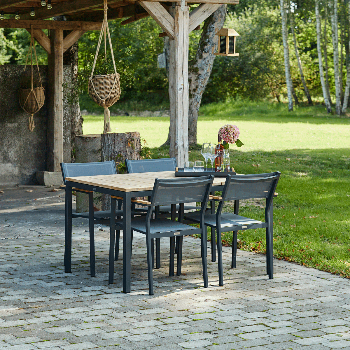 Det klassiske Toscana-bord med bordplade i teak og stel i pulverlakeret aluminium måler 132 cm i længden og 90 cm i bredden. Med samme bredde som de øvrige Toscana-borde, kan havesættet let kombineres med de andre Toscana bordstørrelser, når der skal mange til bords.