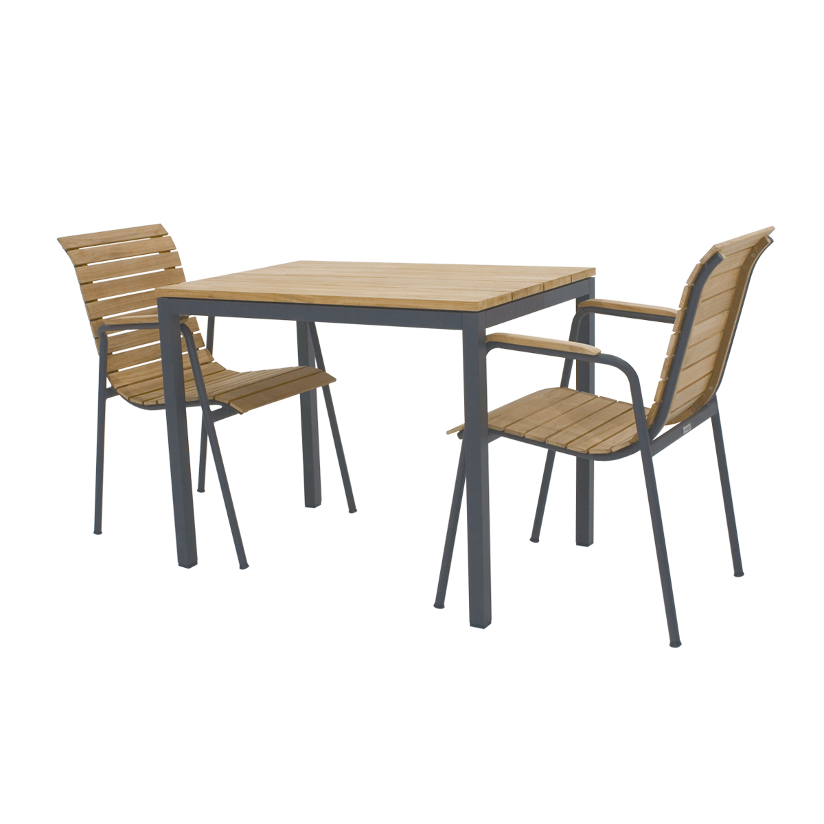 Det klassiske Toscana-bord med bordplade i teak og stel i pulverlakeret aluminium måler 65 cm i længden og 90 cm i bredden. Med samme bredde som de øvrige Toscana-borde, er havesættet ideelt som tilægsbord, når der er flere til bords.