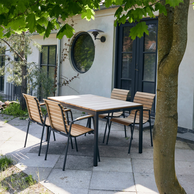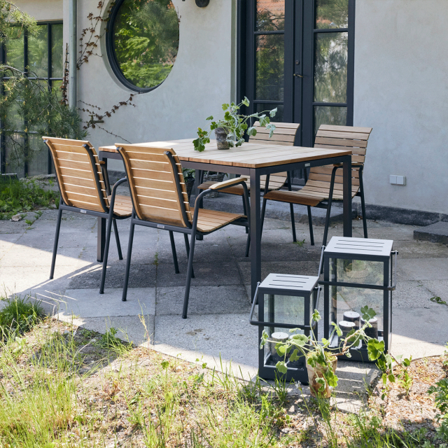 Bellevue-stolens lamel-design passer godt ind i Toscana's bordplade. Smalle lameller, der binder de to møbler sammen og skaber en helhed i designet til terrassen. Bellevue havestolen er designet, så den let kan gå ind under bordets sarg. Og naturligvis har de ergonomisk sæde og ryg.