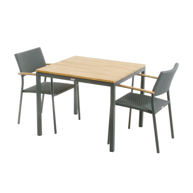 Det klassiske Toscana-bord med bordplade i teak og stel i pulverlakeret aluminium måler 82 cm i længden og 90 cm i bredden. Med samme bredde som de øvrige Toscana-borde, er havesættet ideelt som tillægsbord, når der er flere til bords.