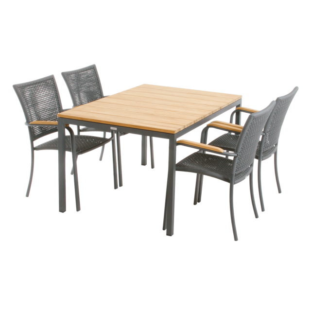 Det klassiske Toscana-bord med bordplade i teak og stel i pulverlakeret aluminium måler 132 cm i længden og 90 cm i bredden. Med samme bredde som de øvrige Toscana-borde, kan havesættet let kombineres med de øvrige Toscana bordstørrelser, når der er mange til bords.
