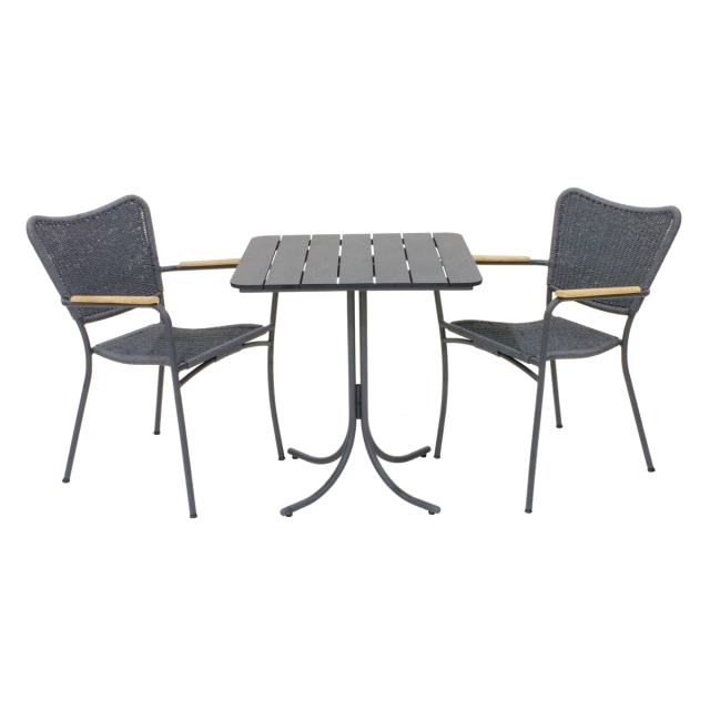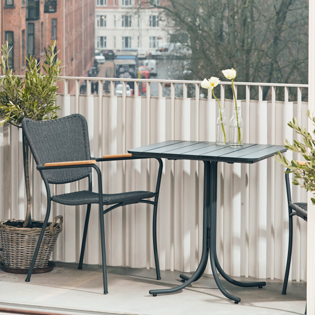 Pure cafésættet passer perfekt til altanen, balkonen eller bare til en afkrog i haven. Bordet er med bordplade i det velkendte kompaktlaminat, der er både formstabilt og modstandsdygtigt overfor vejr og vind. Vi har designet bordet med udgangspunkt i den populære Marguerit-serie, så bordets understel har samme look - men teaktræet er skiftet ud med et helt vedligeholdelsesfrit materiale til bordpladen.
