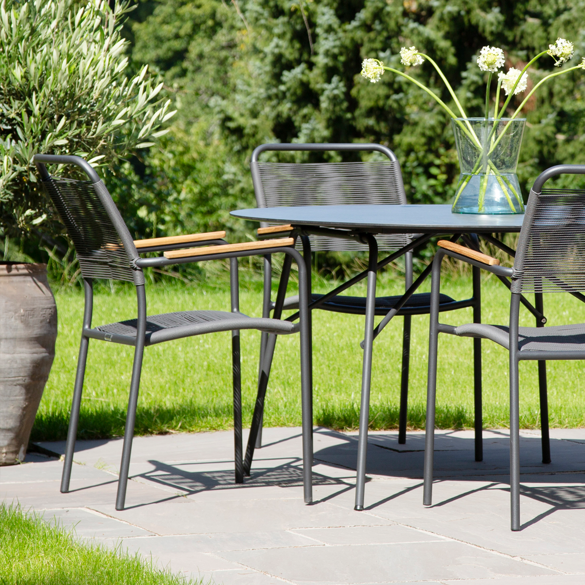 Verona stabelbar havestol med stel i pulverlakeret aluminium og det eksklusive og vejrbestandige SunLoom flet. Verona bringer tankerne tilbage til 70'ernes klassiske snoredesign - med SunLoom flet er den bare endnu stærkere, behageligere og fletten bliver ikke slap. Armlænet er bæredygtig indonesisk teak, og kræver kun minimal vedligeholdelse. Lad dem patinere, og de får en flot kontrastfarve til stolen og bordets bordplade.