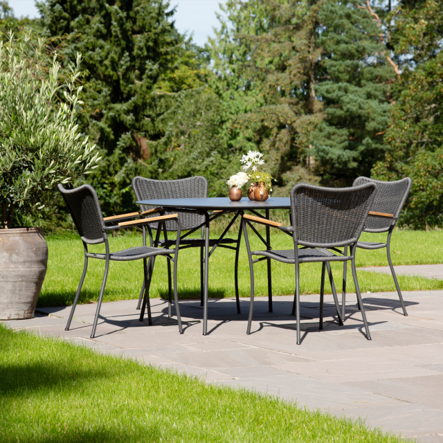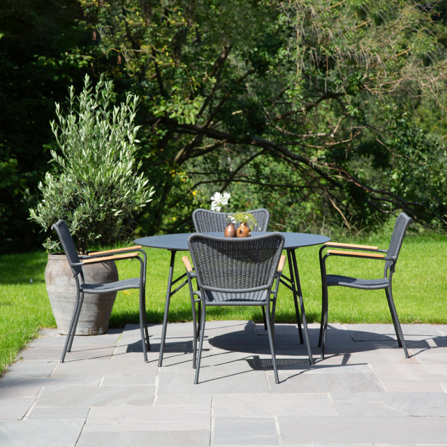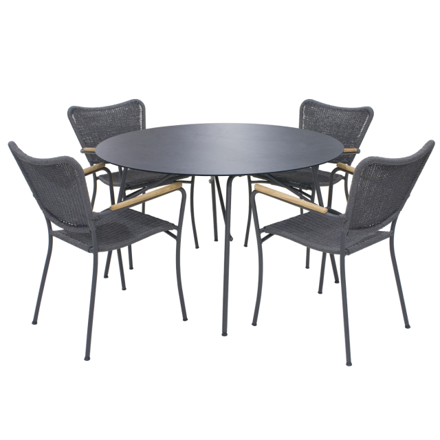 Vi har valgt at sammensætte vores vedligeholdelsesfrie havesæt med stole, der overordnet passer i designet. Blandt andet den 100% vedligeholdelsesfrie havestole Marguerit Pure havestol i pulverlakeret rustfrit stål. Vil du gerne kombinere det nye Pure havebord med et organisk islæt, så kan vi bl.a. anbefale Verona SunLoom eller Verona Teak stolene, der med deres armlæn i teak giver et mere organisk udtryk. Over tid vil deres armlæn patinere og få en flot kontrastfarve til Pure-bordets mørke overflade.