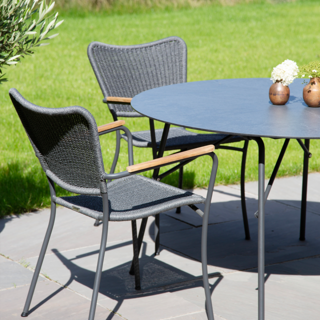 Det velkendte design fra Marguerit-stolen er bibeholdt, men materialerne ændret. Det har givet endnu en stol, hvor ergonomien og komforten er i top - og du behøver ikke tænke på vedligeholdelse. Vi har overført teak-armlænet til stolen, for at give den et strejf af et organisk udtryk. Når teaken patinerer, får den en smuk kontrastfarve til det mørke reb og til laminat-bordets udtryk.