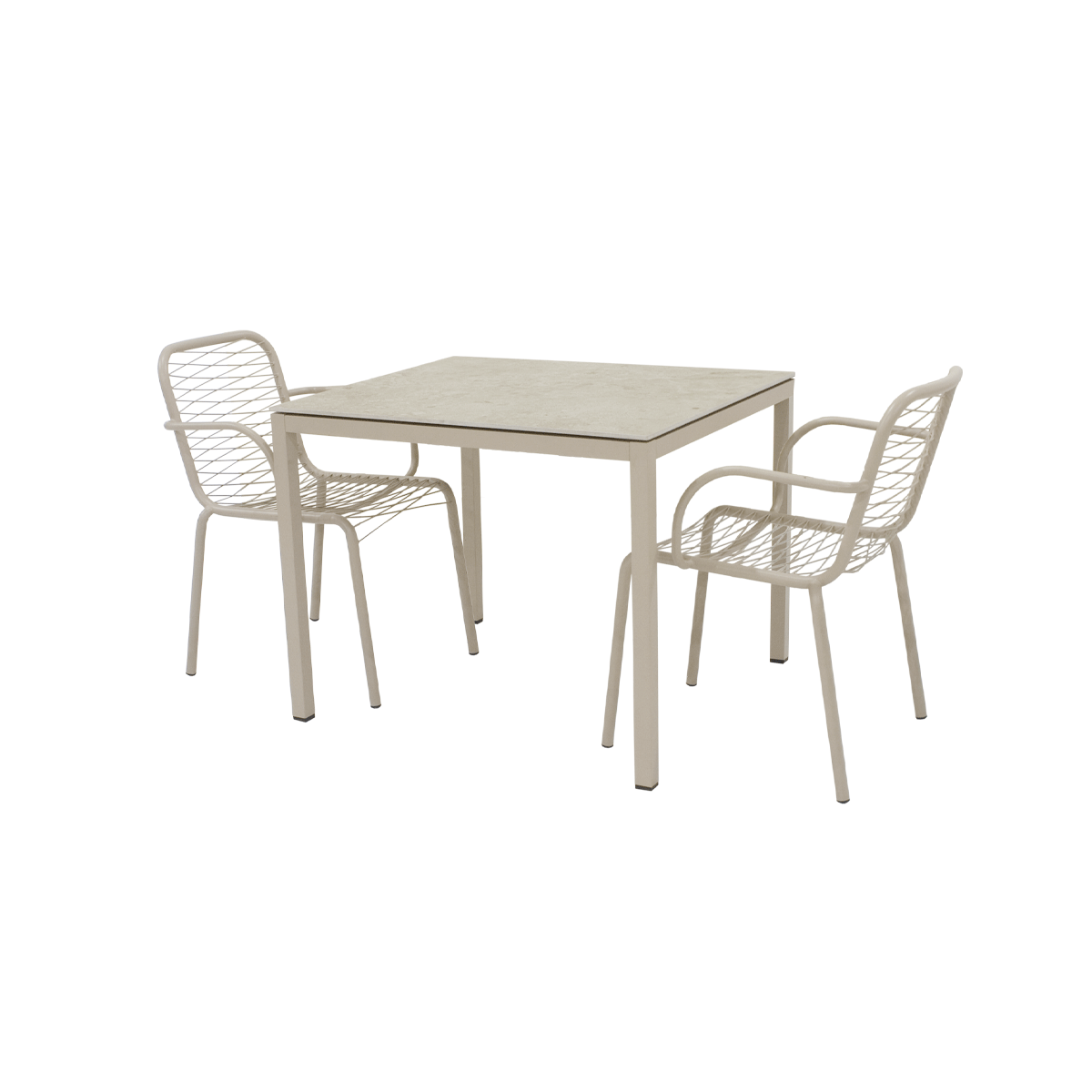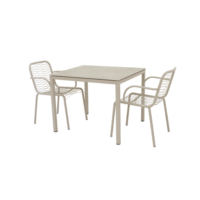 Terra-bordet måler 82 cm i længden og 90 cm i bredden, og er fremstillet i pulverlakeret aluminium med stel i den populære taupe-farve og en smuk, meleret keramisk bordplade. Den keramiske overflade giver et blødt og indbydende look – helt uden behov for vedligeholdelse. Skal der flere til bords, så har bordene samme bredde, så du kan stille dem i forlængelse af hinanden.