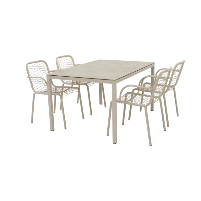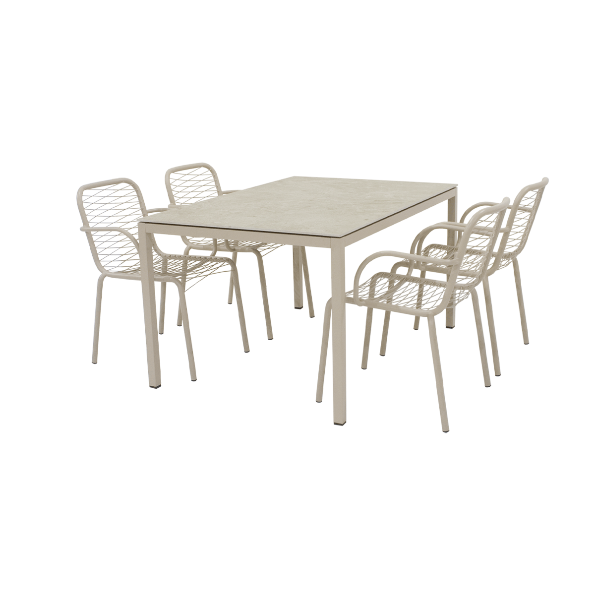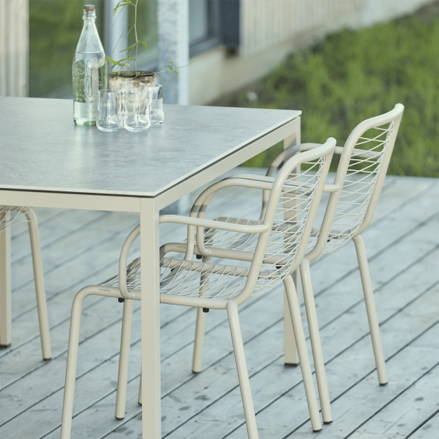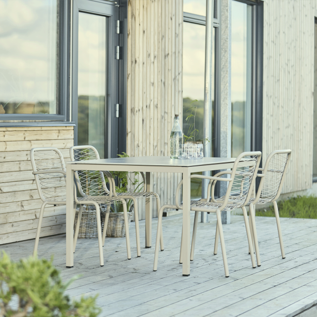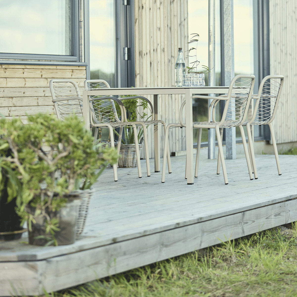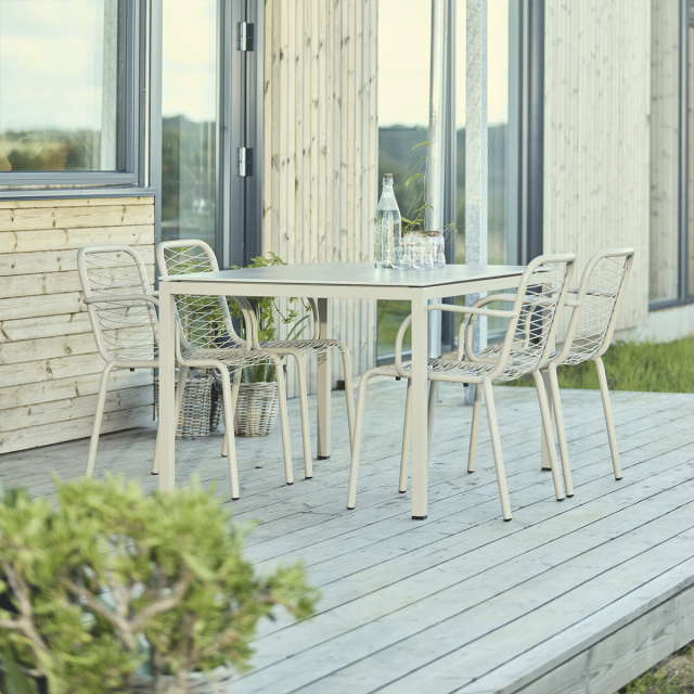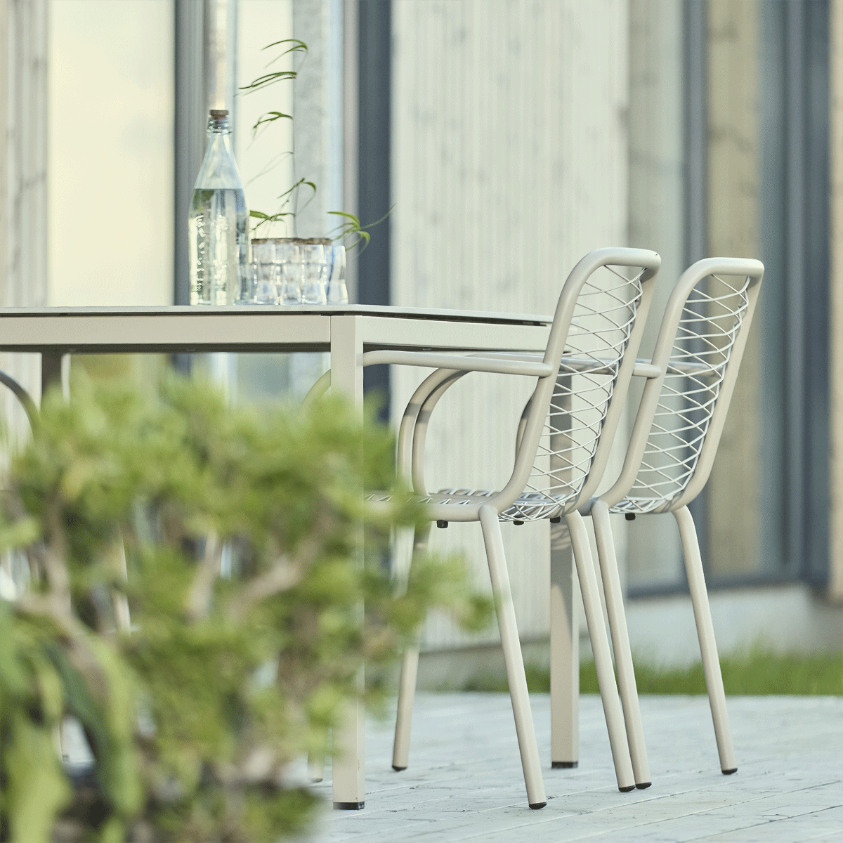 Opdag det nye Terra havesæt med Ivy Wire havestole – et elegant valg til terrassen med et tidløst design og varme, naturlige farver. Terra-bordene lanceres til sæson 2026 og kombinerer praktisk funktionalitet med et stilfuldt udtryk.