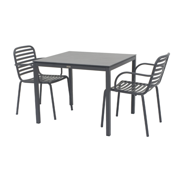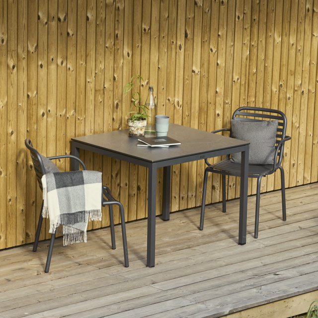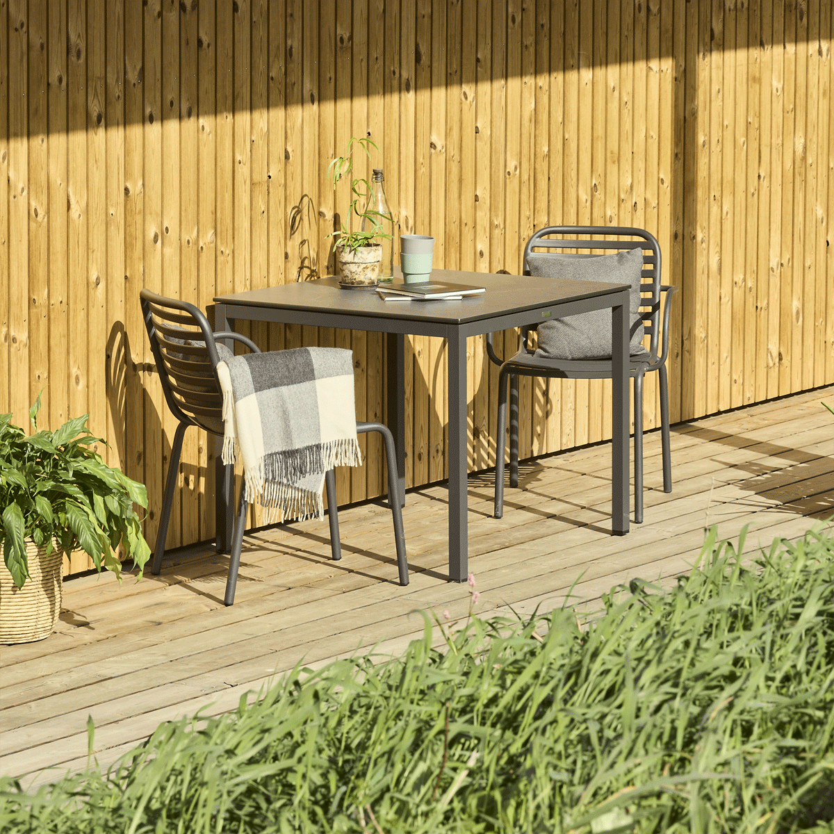 Vedligeholdelsesfrit havesæt – et elegant valg til terrassen med et tidløst design. Pure-bordene er designet med kompaktlaminat i skiffer-look og kombinerer praktisk funktionalitet med et stilfuldt udtryk.