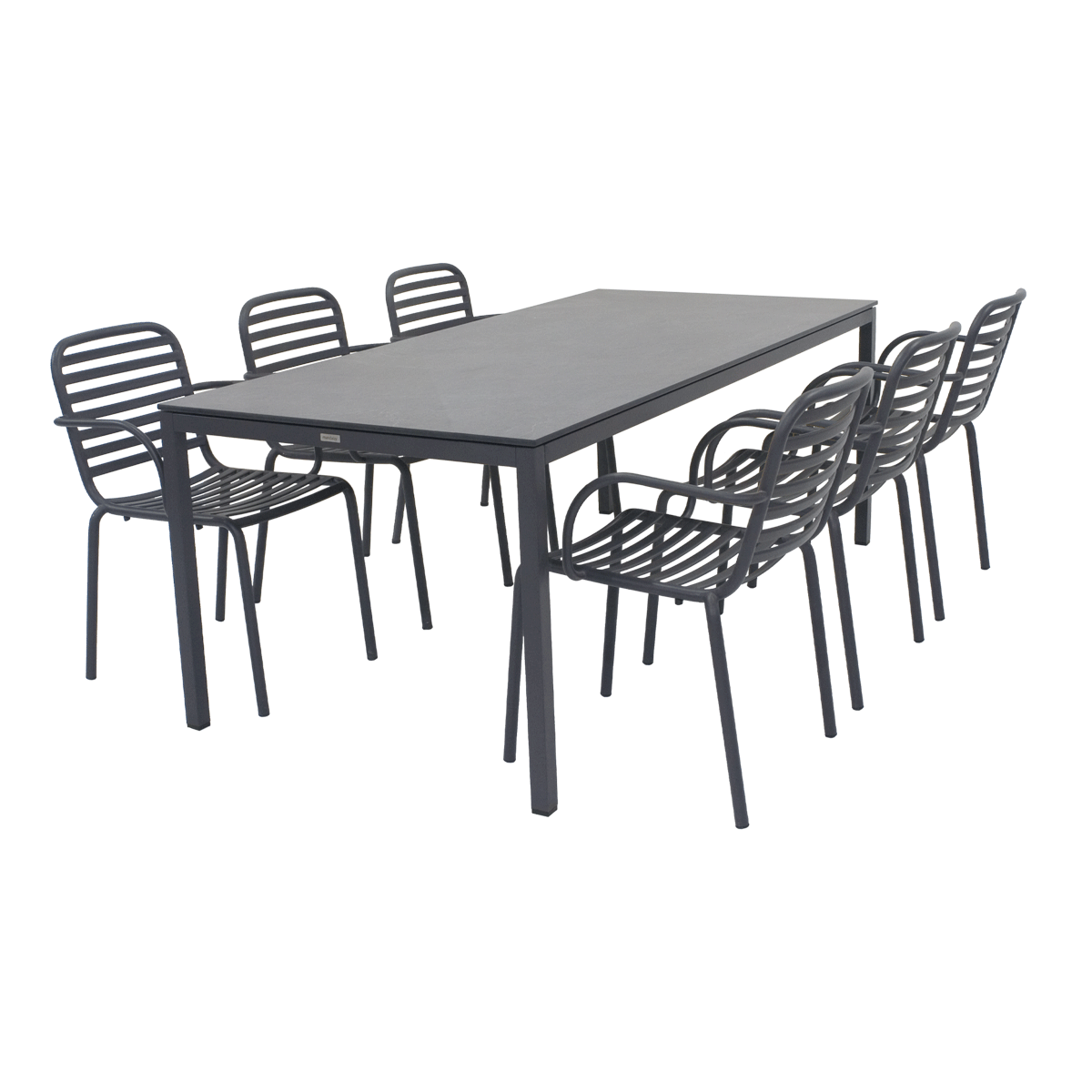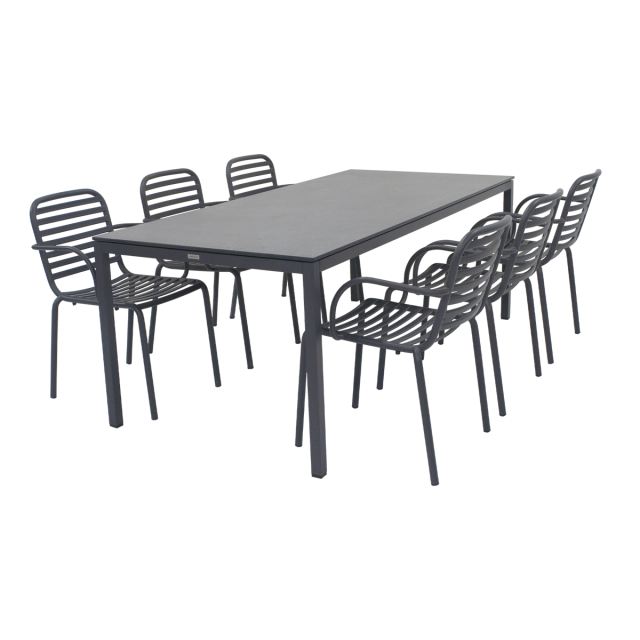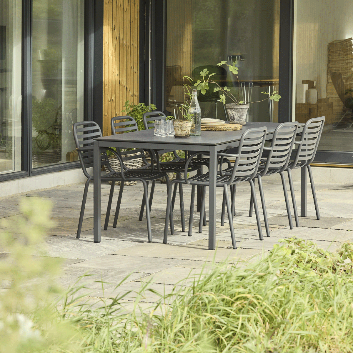 Vedligeholdelsesfrit havesæt – et elegant valg til terrassen med et tidløst design. Pure-bordene er designet med kompaktlaminat i skiffer-look og kombinerer praktisk funktionalitet med et stilfuldt udtryk.