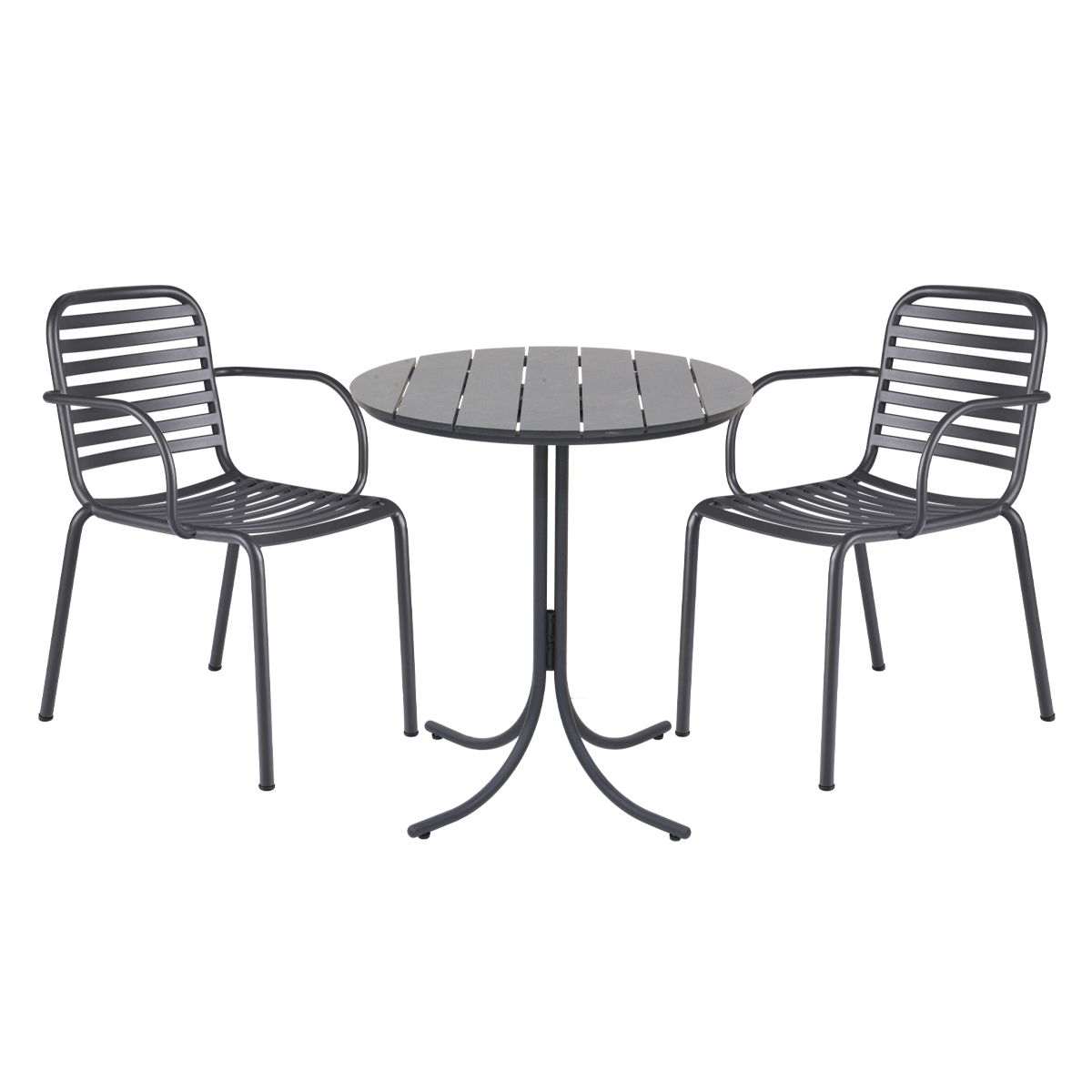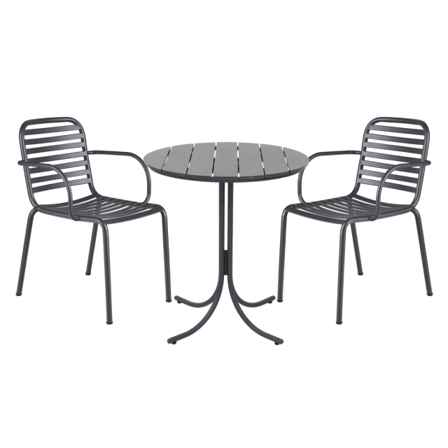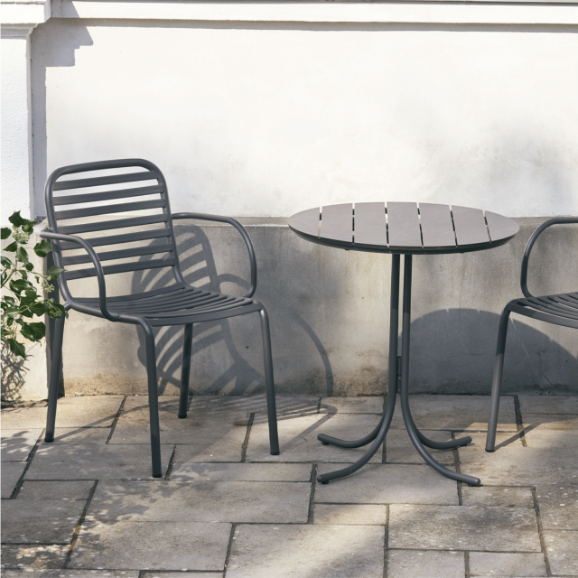 Pure cafésættet passer perfekt til altanen, balkonen eller bare til en afkrog i haven. Bordet er med bordplade i det velkendte kompaktlaminat, der er både formstabilt og modstandsdygtigt overfor vejr og vind. Vi har designet bordet med udgangspunkt i den populære Marguerit-serie, så bordets understel har samme look - men teaktræet er skiftet ud med et helt vedligeholdelsesfrit materiale til bordpladen.