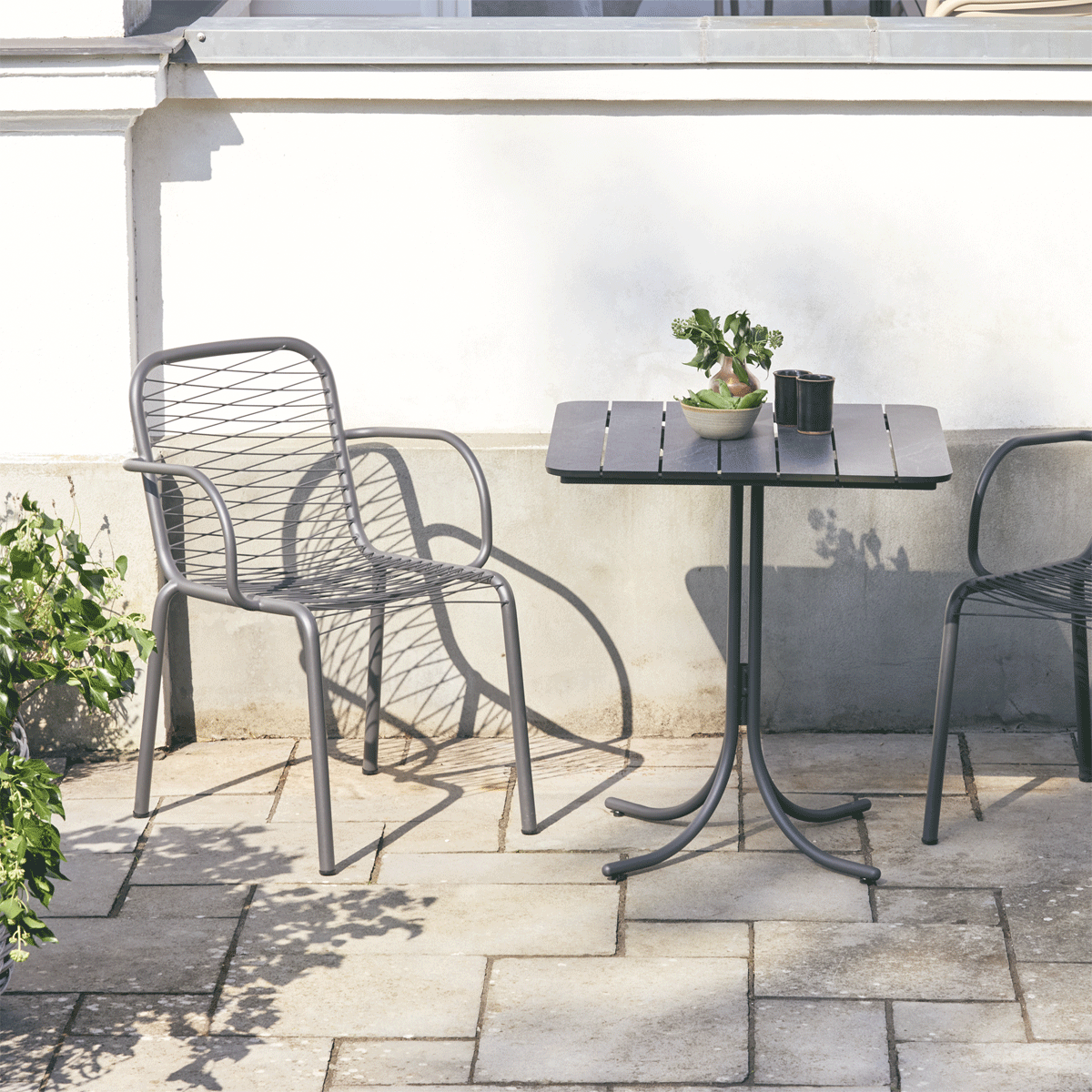 Pure & Ivy cafésættet passer perfekt til altanen, balkonen eller bare til en afkrog i haven. Bordet er med bordplade i det velkendte kompaktlaminat, der er både formstabilt og modstandsdygtigt overfor vejr og vind. Vi har designet bordet med udgangspunkt i den populære Marguerit-serie, så bordets understel har samme look - men teaktræet er skiftet ud med et helt vedligeholdelsesfrit materiale til bordpladen.