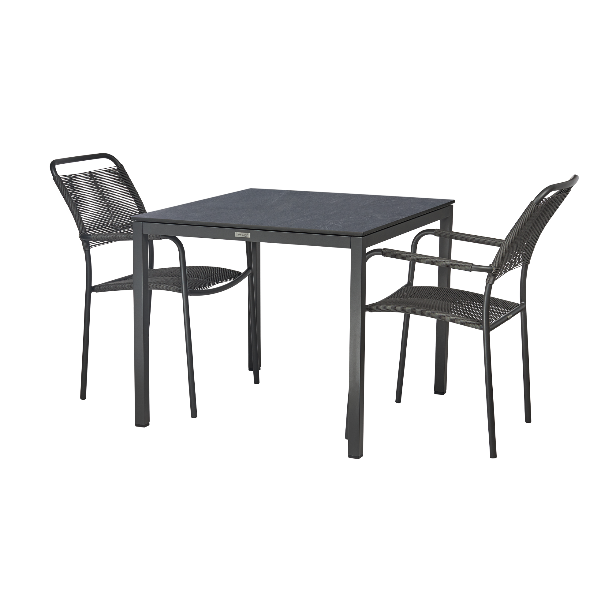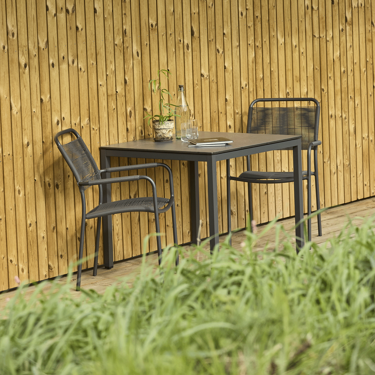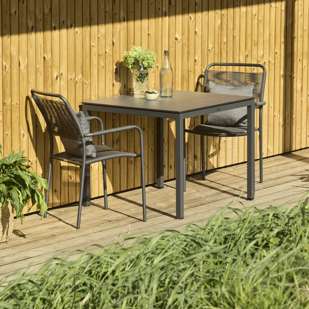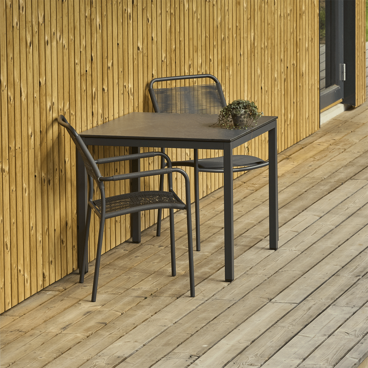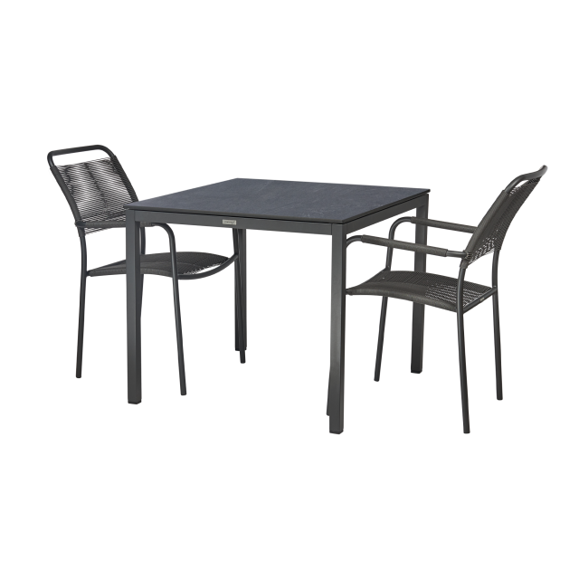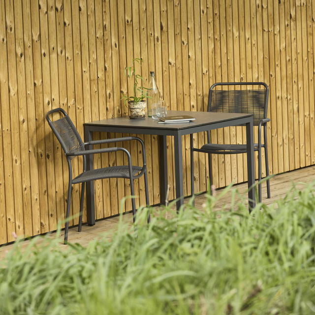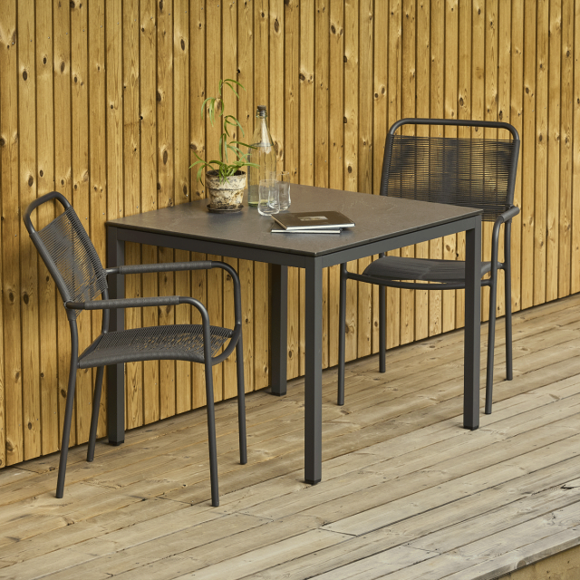 Havemøbelsæt til altanen eller den lille terrasse. Pure bord med bordplade i skifer-look og to Verona-stole med SunLoom armlæn
