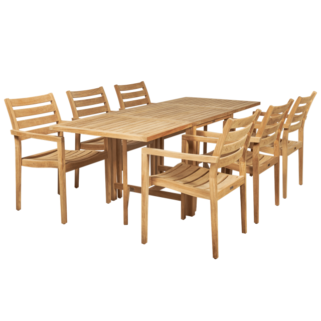 Klassisk klapbord med 6 stabelbare stole - alt i indonesisk teak.