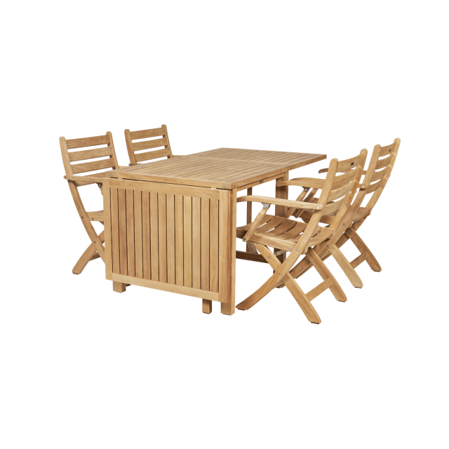 Klassisk havesæt med fire smukke Dian foldestole i indonesisk teak - og stramme linjer inspireret af skandinaviske design-traditioner.