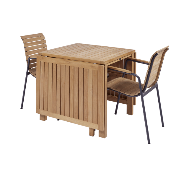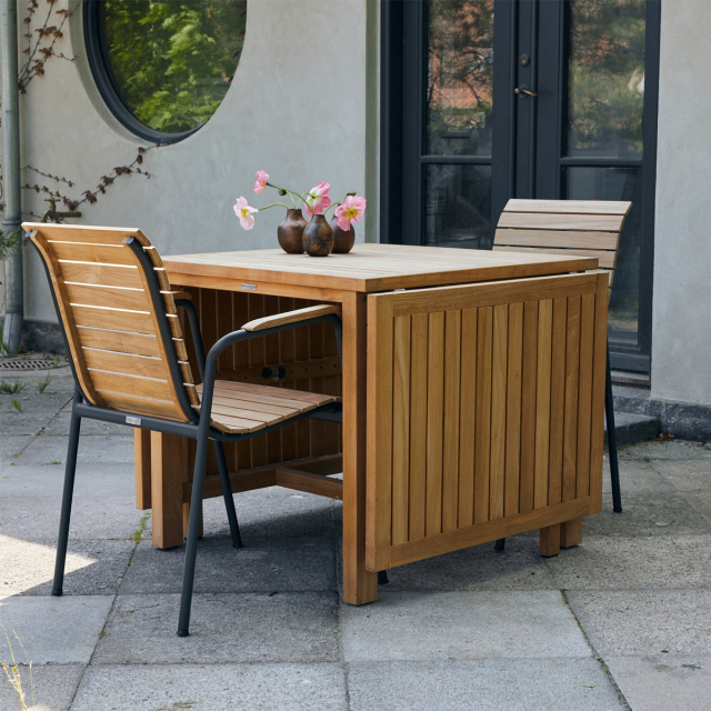 Cambridge klapbordet er i indonesisk plantageteak, og giver dig de bedste betingelser for at spare plads. Det er især en fordel i den lille have eller på den lille terrasse. Er I kun to personer til hverdag, kan klapperne i begge sider klappes ned til daglig, så bordet ikke optager unødigt plads. Designet passer perfekt til Bellevue stolenes klassiske look. Bordet er let at folde ud, hvis I bliver flere til komsammen på terrassen - helt op til 8 pladser kan der være. Udslået måler bordet hele 200 cm i længden og 80 cm i bredden.