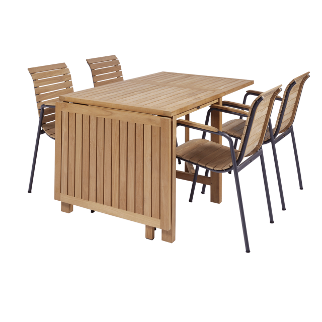 Cambridge klapbordet er i indonesisk plantageteak, og giver dig de bedste betingelser for at spare plads. Det er især en fordel i den lille have eller på den lille terrasse. Er I kun to personer til hverdag, kan klapperne i begge sider klappes ned til daglig, så bordet ikke optager unødigt plads. Designet passer perfekt til Bellevue stolenes klassiske look. Bordet er let at folde ud, hvis I bliver flere til komsammen på terrassen - helt op til 8 pladser kan der være. Udslået måler bordet hele 200 cm i længden og 80 cm i bredden.