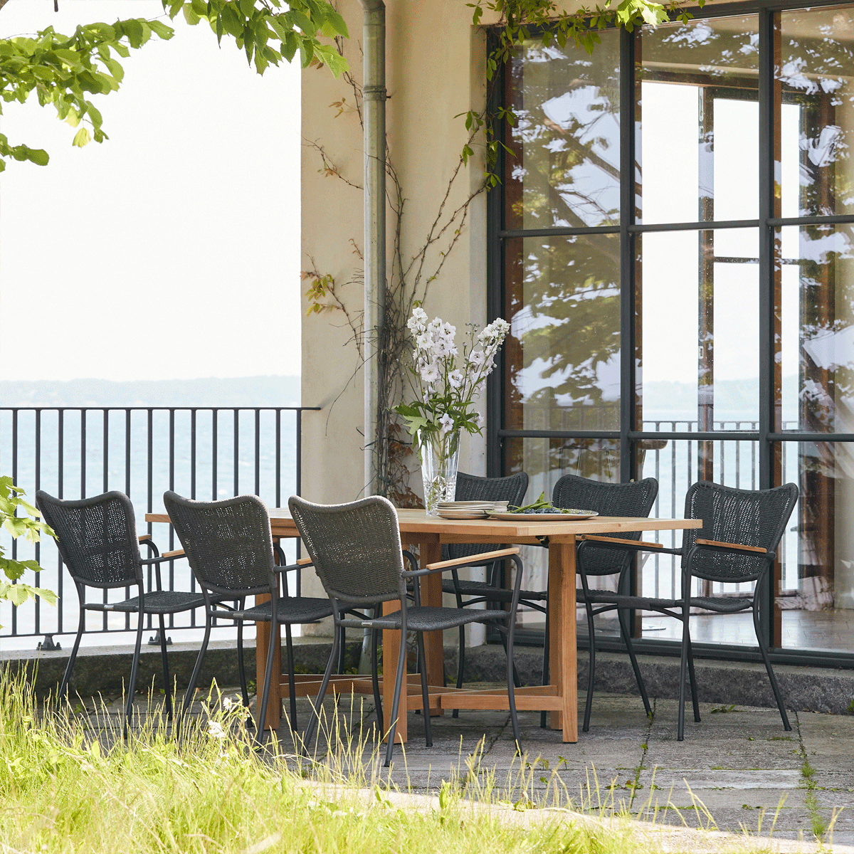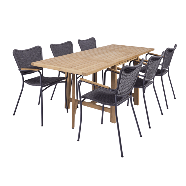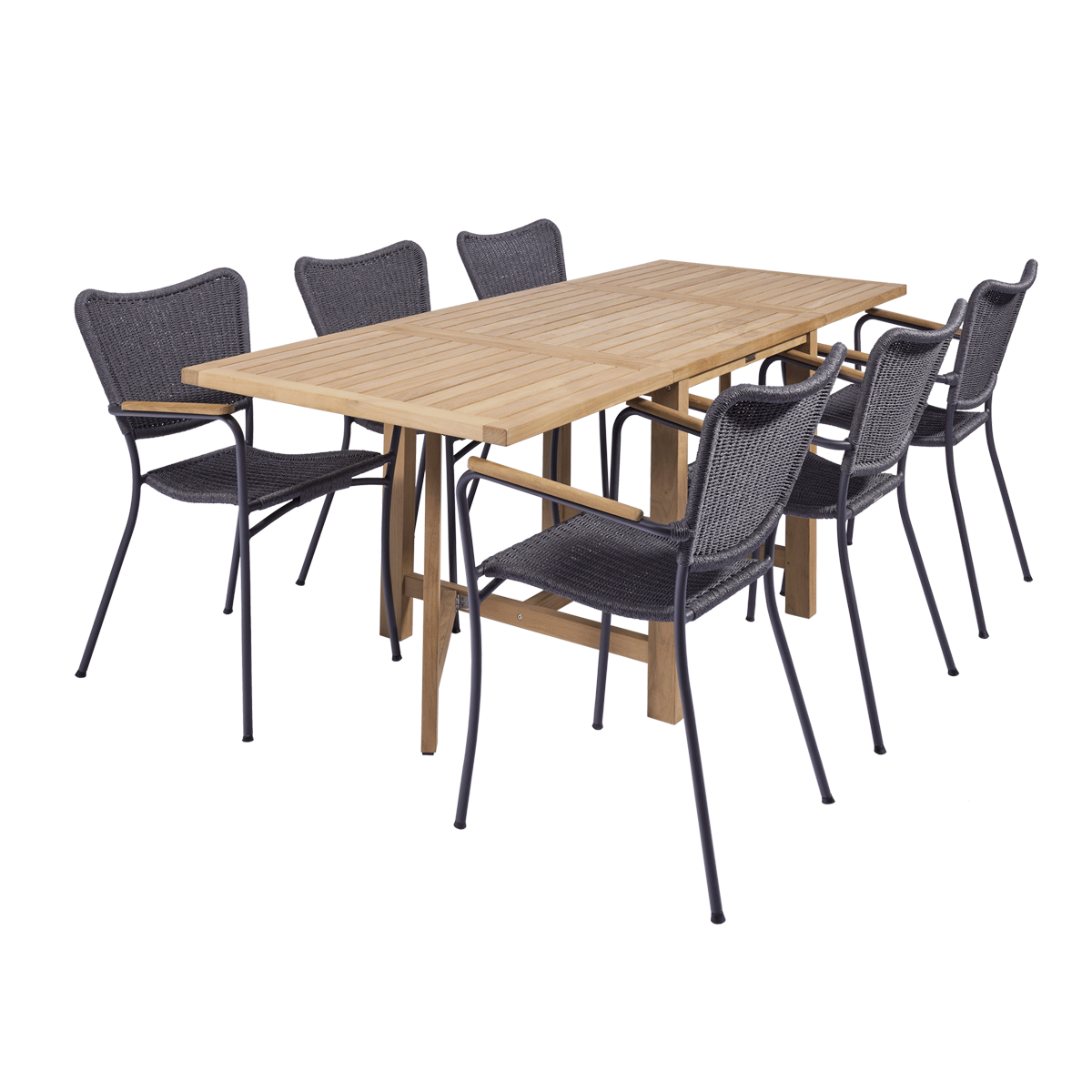 Klassisk havesæt i bæredygtig indonesisk teak med seks Marguerit String havestole med antracit stel. Når klapbordet er foldet ud, så har du plads til hele otte personer.