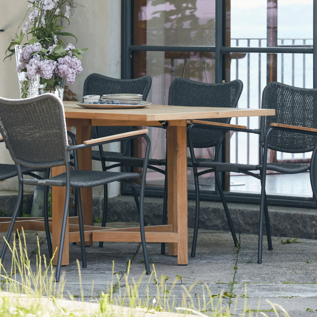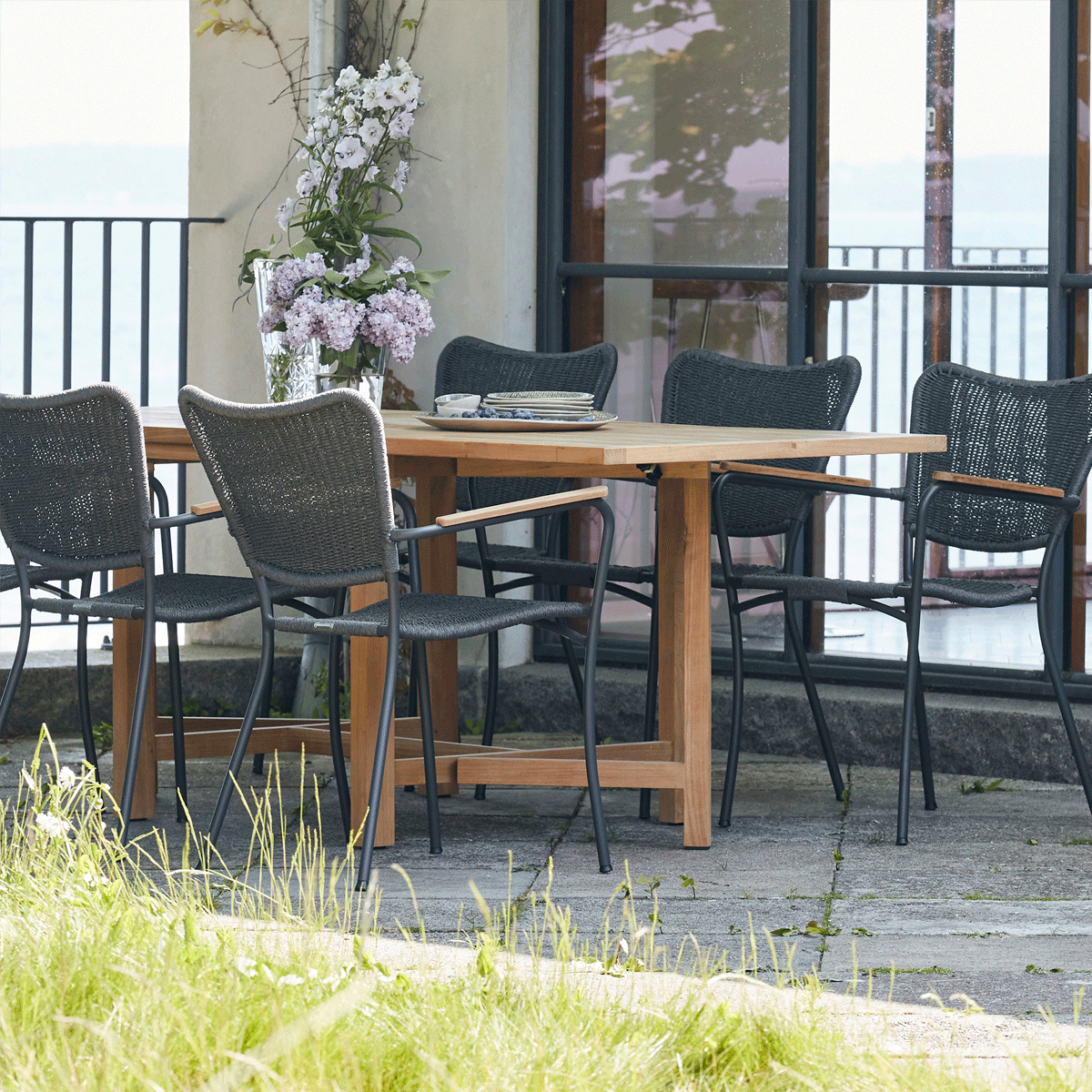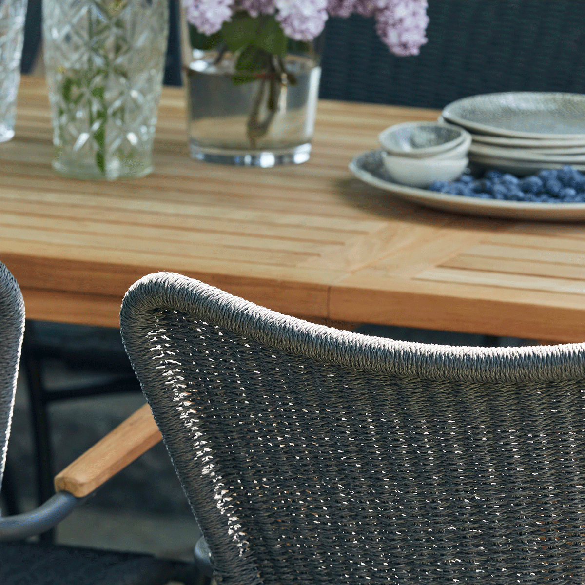 Marguerit String stolen er en flot stabelbar havestol med antracit flet og stel. Det velkendte design fra Marguerit-stolen er bibeholdt, men materialerne ændret. Det har givet endnu en stol, hvor ergonomien og komforten er i top - og du behøver ikke tænke på vedligeholdelse. Vi har overført teak-armlænet til stolen, for at give den et strejf af et organisk udtryk. Når teaken patinerer, får den en smuk kontrastfarve til det mørke reb. Havestolen er lavet med snoet materiale i reb. Materialet er vandafvisende og kan modstå det omskiftelige vejr i Danmark. Med en helhynde får du endnu mere ud af timerne i den danske sommer.