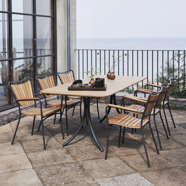 Magnolia havebordet måler hele 197 cm og 90 cm i bredden. Bordbenenes design gør det let at have både familie og venner til bords, da ingen kommer til at have problemer med bordbenene. Bordet er med smukt forarbejdet indonesisk teak og stellet er pulverlakeret aluminium.