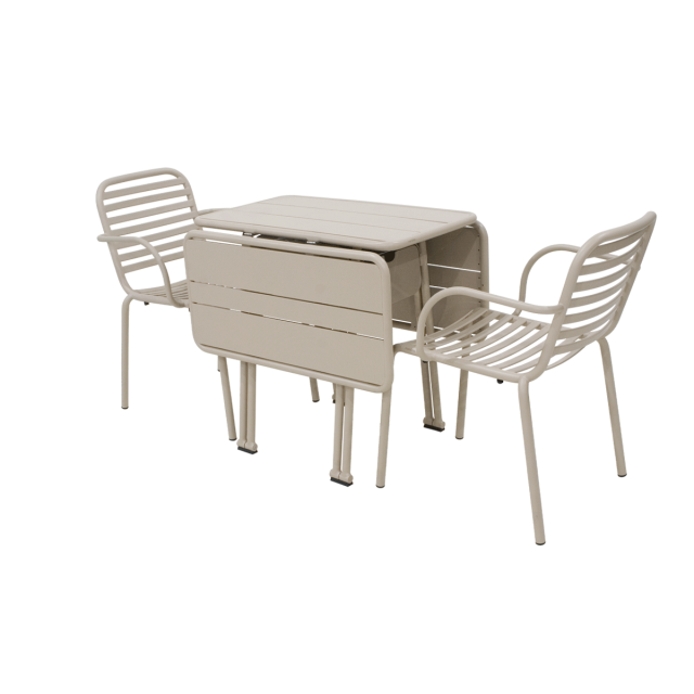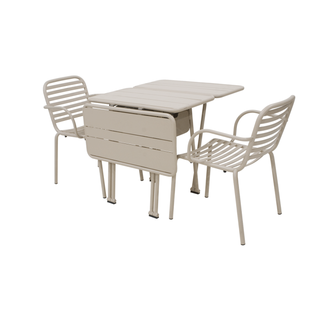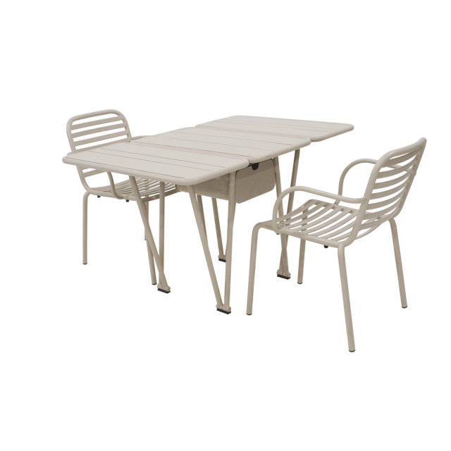 Praktisk havesæt til den lille terrasse eller til altanen. Ivy-havesættet med klapbord og to Ivy Pipe havestole i taupe stelfarve. Serien er specifikt designet til altaner og små uderum. Bordet kan justeres, så der er plads til op til 6 personer. Er pladsen ekstra trang, så har bordet en praktisk udtræksskuffe, så småting til middagen kan gemmes væk men samtidig være lige ved hånden. Bordet er designet med et unikt rotationsled i fødderne, så det hurtigt og ubesværet kan foldes ud efter behov.