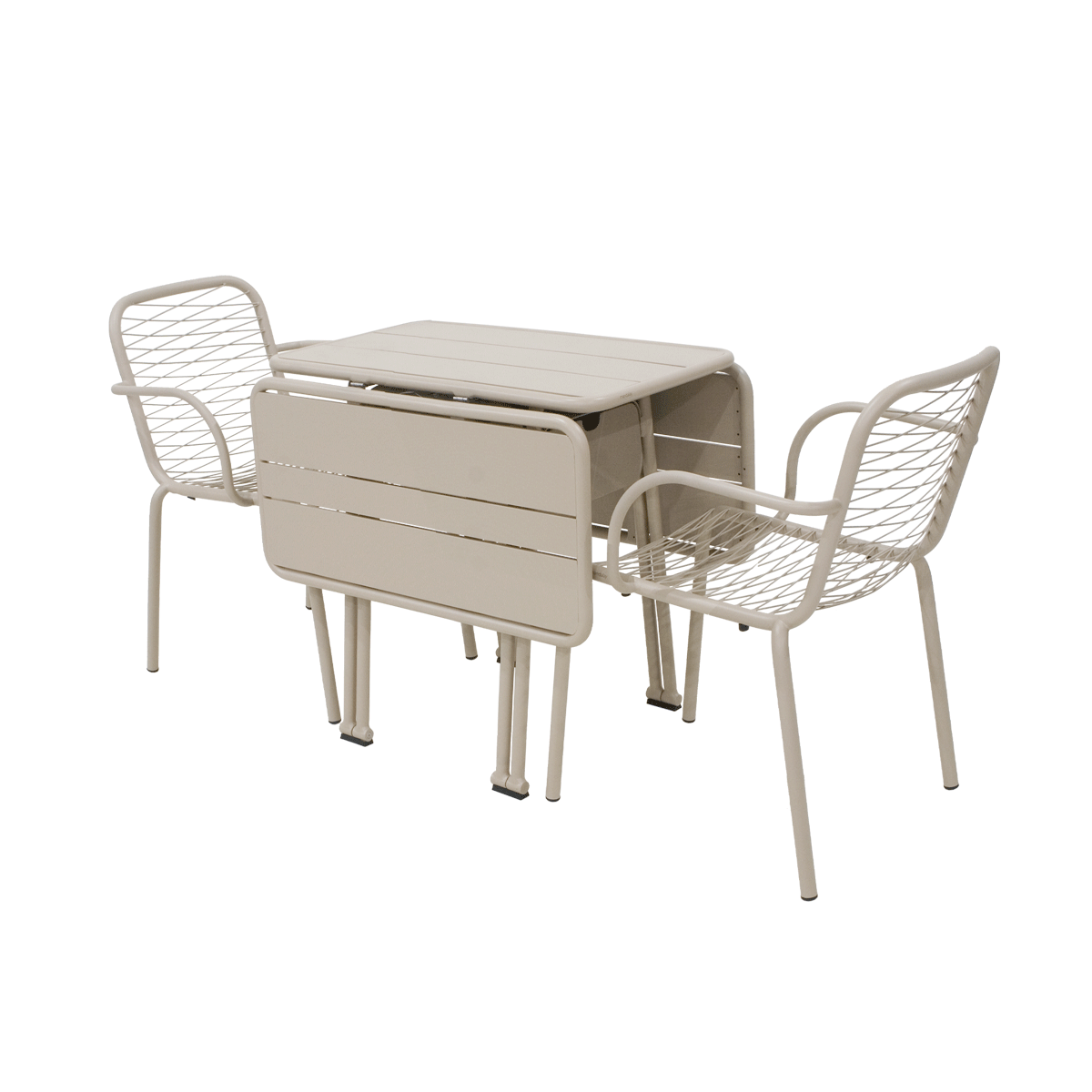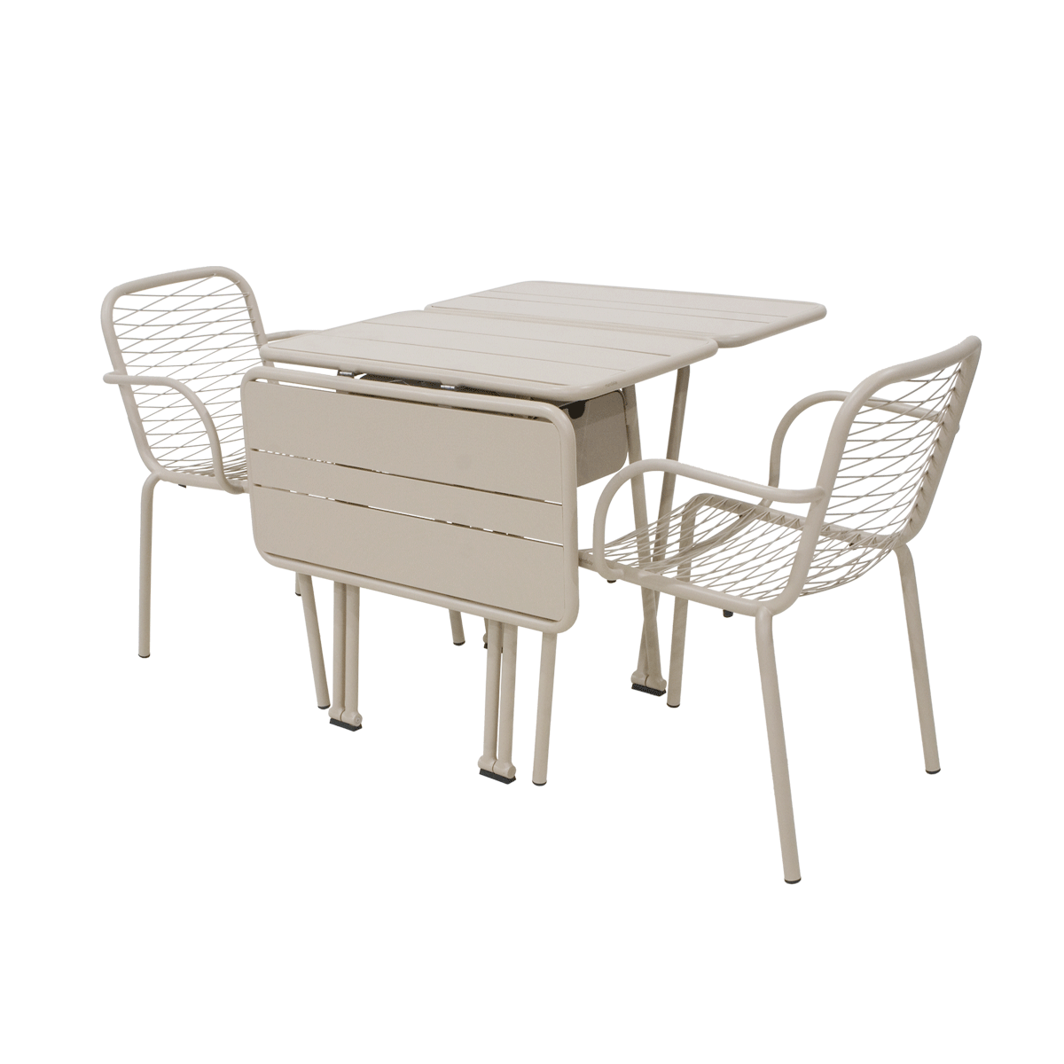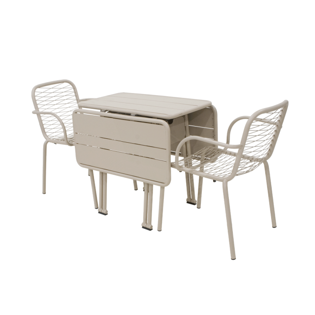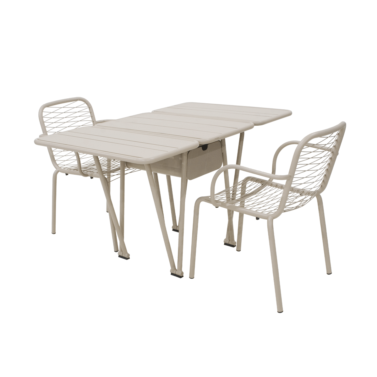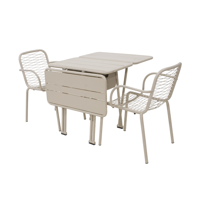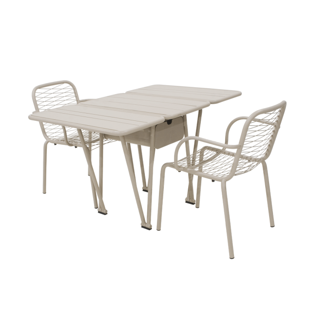 Praktisk havesæt til den lille terrasse eller til altanen. Ivy-havesættet med klapbord og to Ivy Wire havestole i taupe stelfarve. Serien er specifikt designet til altaner og små uderum. Bordet kan justeres, så der er plads til op til 6 personer. Er pladsen ekstra trang, så har bordet en praktisk udtræksskuffe, så småting til middagen kan gemmes væk men samtidig være lige ved hånden. Bordet er designet med et unikt rotationsled i fødderne, så det hurtigt og ubesværet kan foldes ud efter behov.