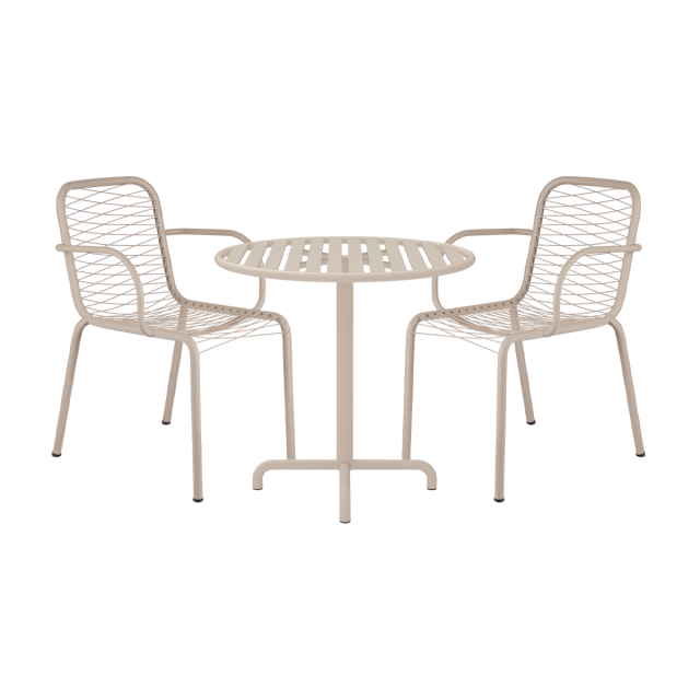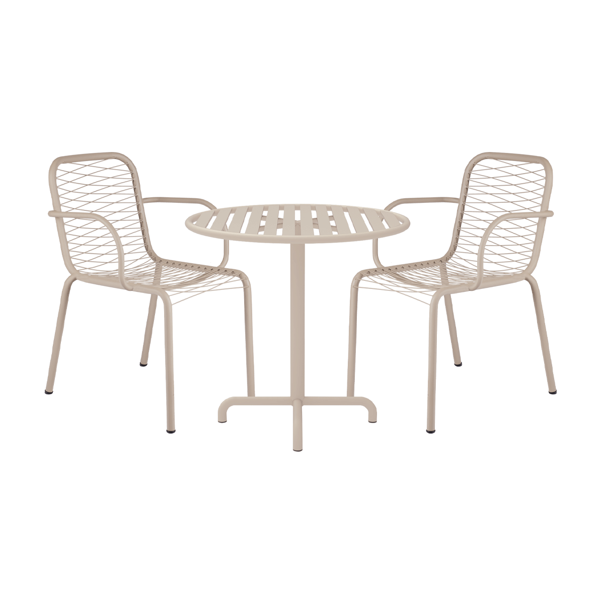 Cafésæt i vejrbestandige materialer. Ideelt cafesæt til altanen og balkonen - og til det omskiftelige danske vejr. Designet af Mathias Falkenstrøm