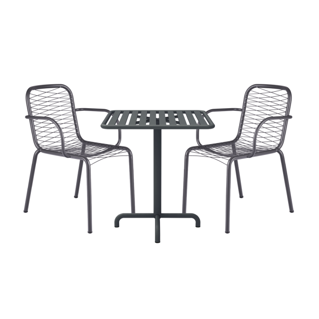 Det firkantede Ivy cafésæt med Ivy Wire stole passer perfekt til altanen, balkonen eller bare til en afkrog i haven.  Den regulære størrelse og de hårdføre materialer, dør det perfekt til udeliv året rundt. Vi ønskede at skabe et cafésæt , der kunne anvendes hele året i de små uderum - uden at man behøver stille det ind for vinteren. Havesættet er ideelt for dem, der ikke har mulighed for at stille det væk for vinteren i et kælderrum, loftsrum eller under halvtag.