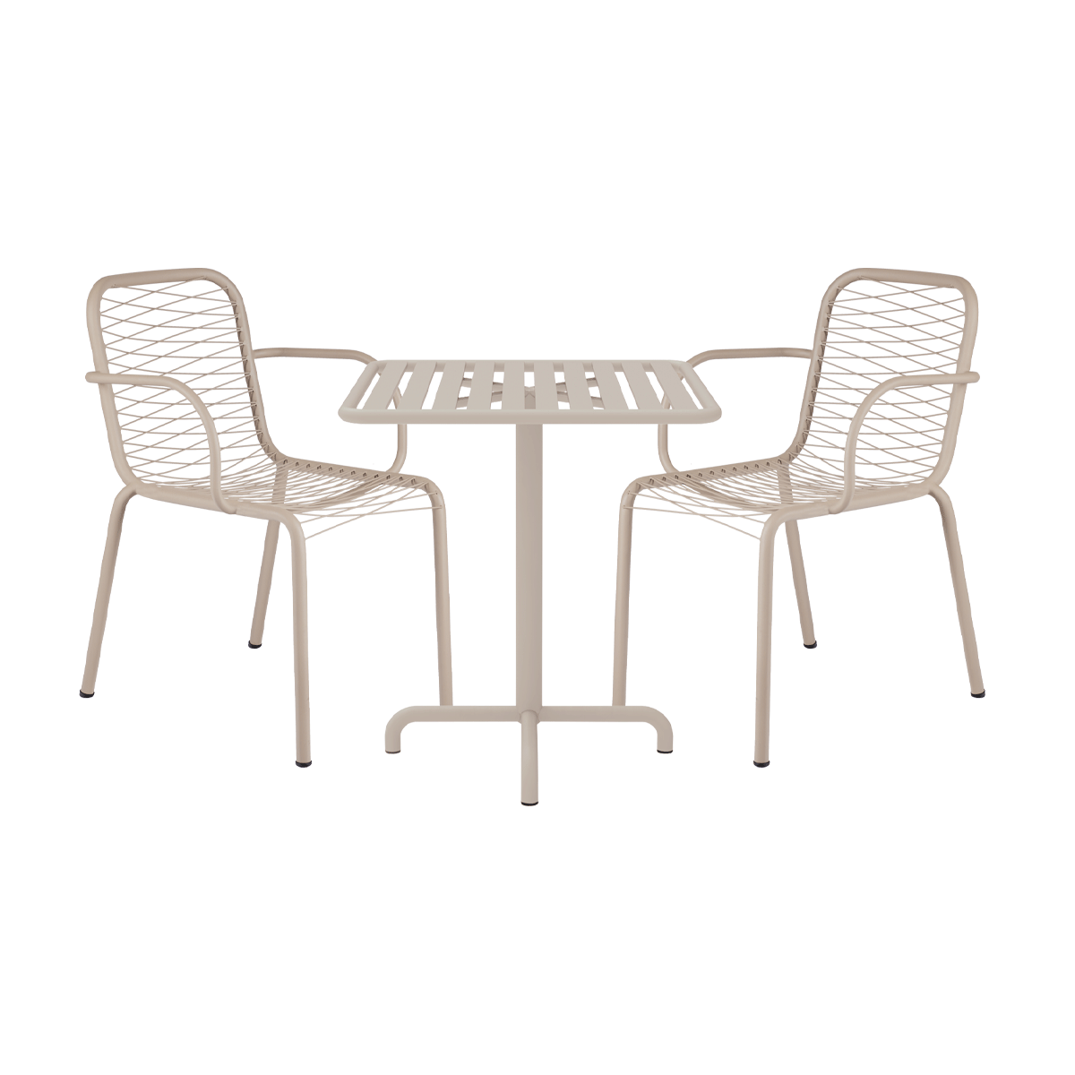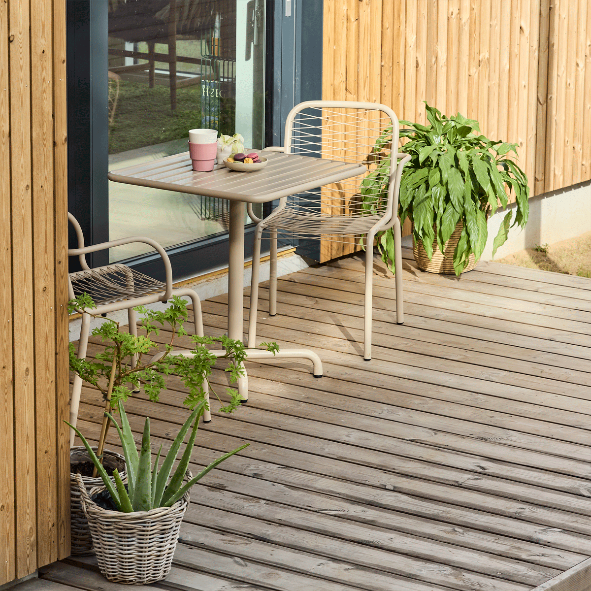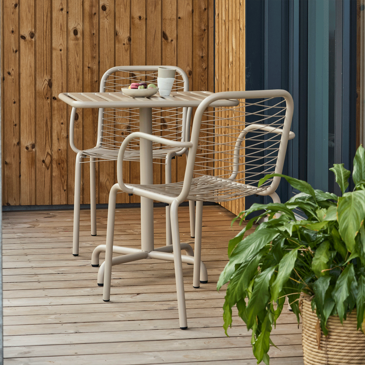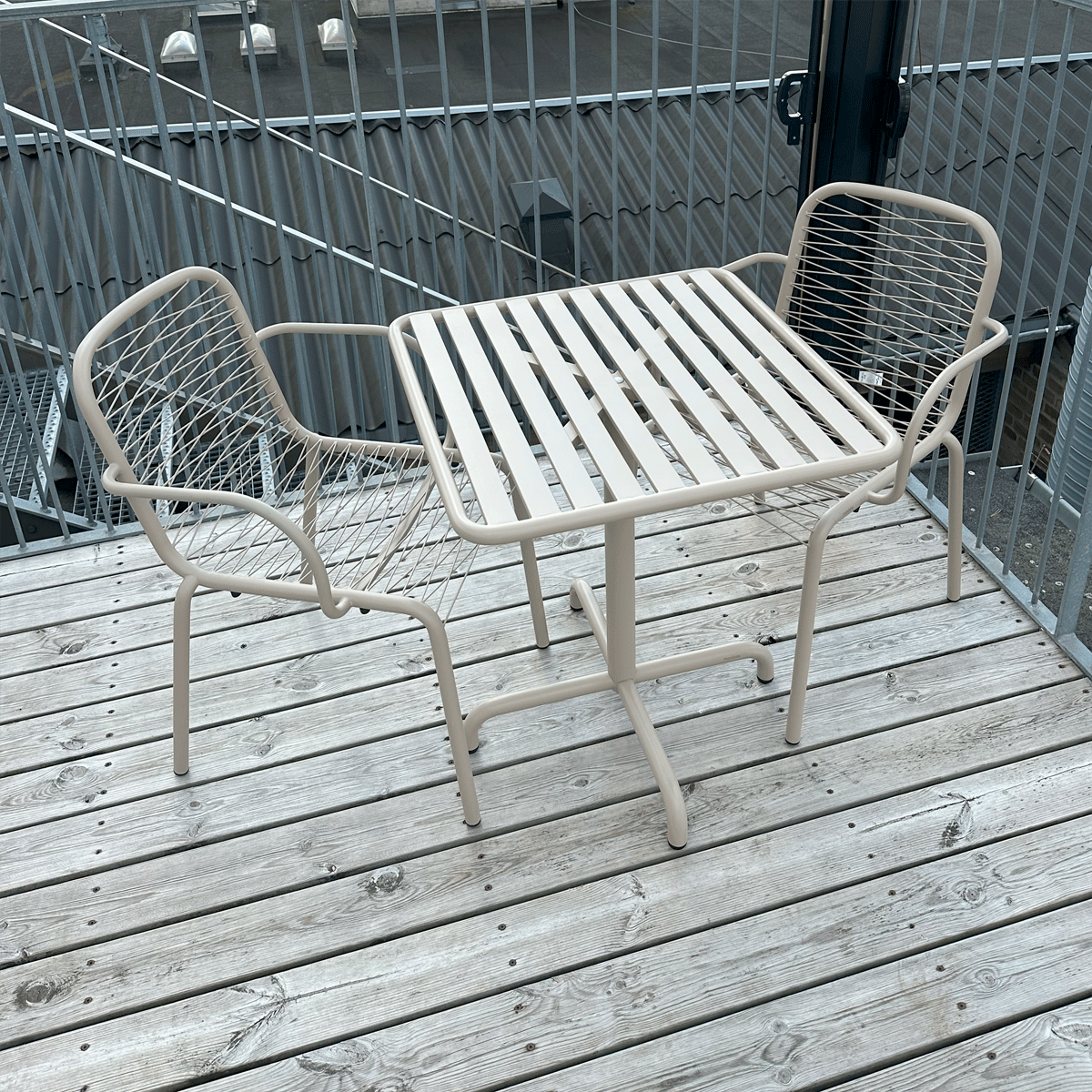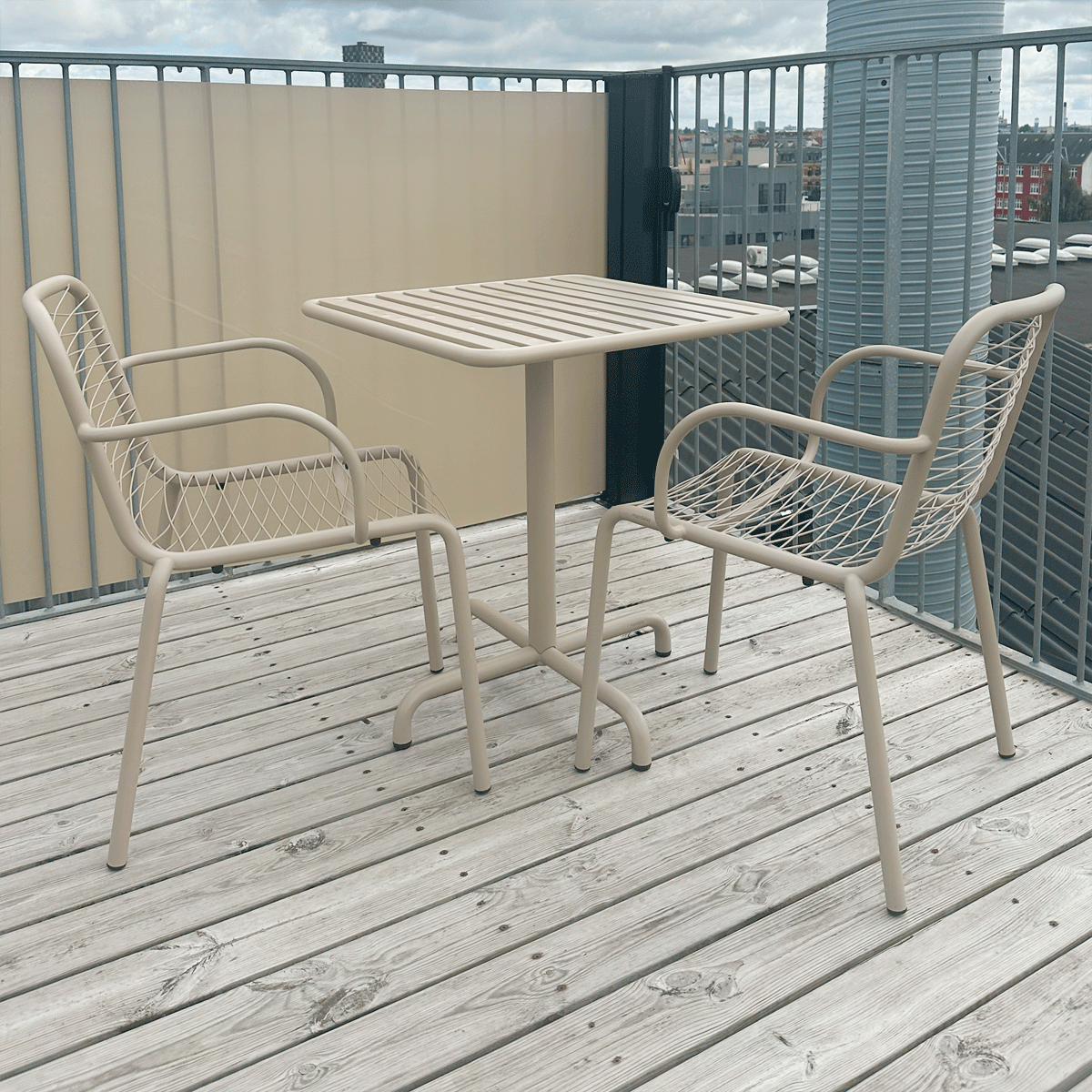 Cafésæt i vejrbestandige materialer. Ideelt cafesæt til altanen og balkonen - og til det omskiftelige danske vejr. Designet af Mathias Falkenstrøm