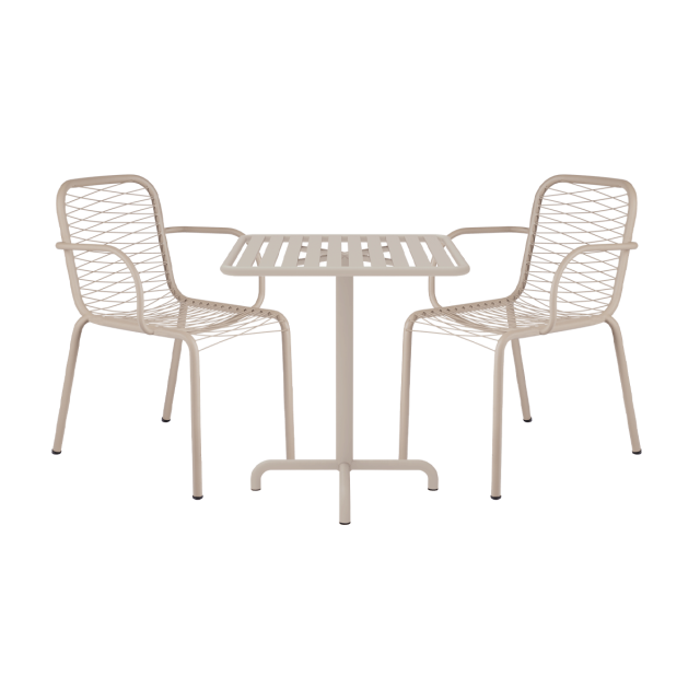 Det firkantede Ivy cafésæt med Ivy Wire stole passer perfekt til altanen, balkonen eller bare til en afkrog i haven.  Den regulære størrelse og de hårdføre materialer, dør det perfekt til udeliv året rundt. Vi ønskede at skabe et cafésæt , der kunne anvendes hele året i de små uderum - uden at man behøver stille det ind for vinteren. Havesættet er ideelt for dem, der ikke har mulighed for at stille det væk for vinteren i et kælderrum, loftsrum eller under halvtag.