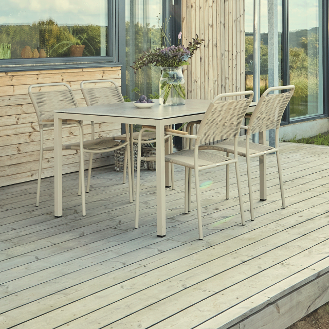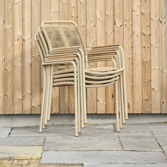 Verona havestolen har fået armlæn i bæredygtig indonesisk plantageteak. Stolen er designet til at passe til designet på flere af vores haveborde. Verona stabelbar havestol med stel i pulverlakeret aluminium og det eksklusive og vejrbestandige SunLoom flet. Verona bringer tankerne tilbage til 70'ernes klassiske snoredesign - med SunLoom flet er den bare endnu stærkere, behageligere og fletten bliver ikke slap.